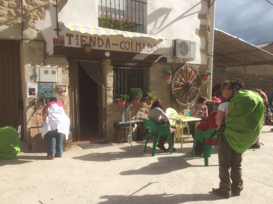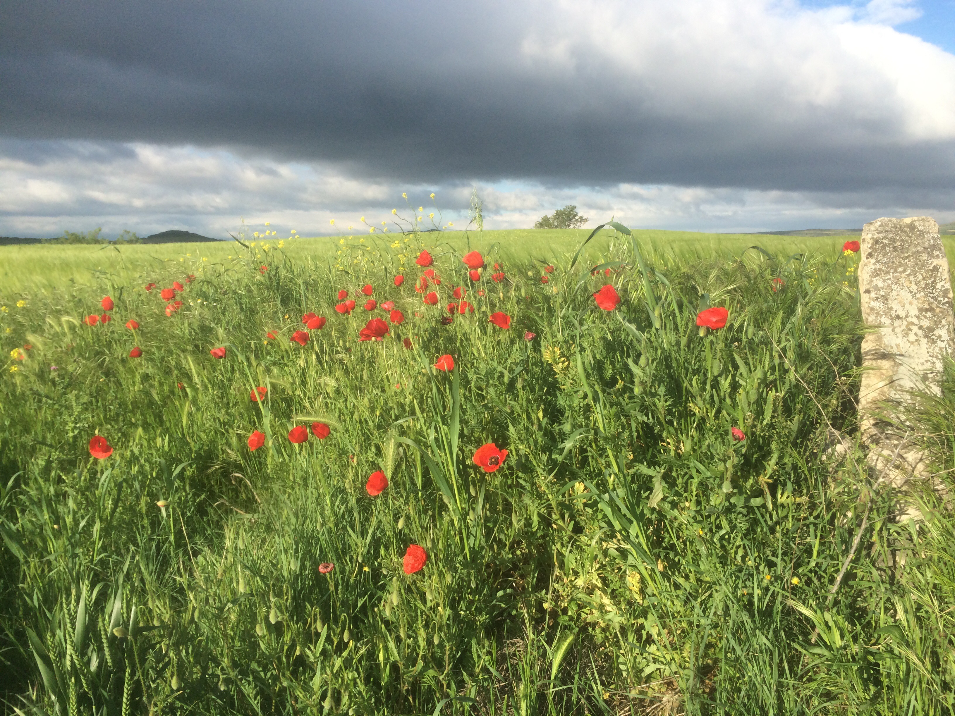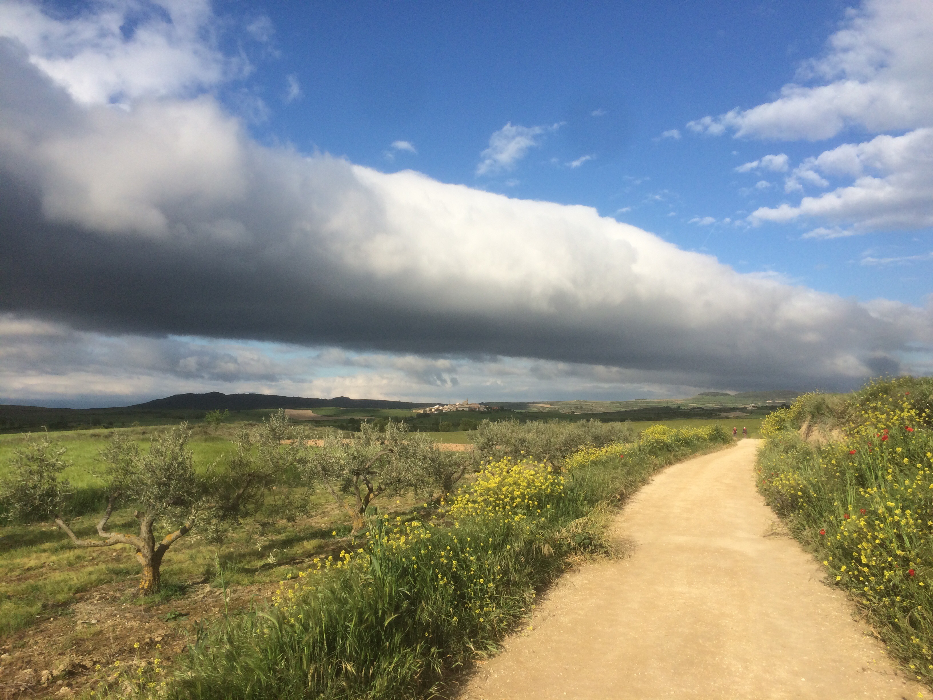 It’s Saturday in another charming small town in Navarra, Viana. The approach to these towns is always the same. You see the town ahead, in among the hills, and as you get closer you can see the church in the centre and at the highest point. You enter the town through narrow winding streets to protect against the summer sun until you reach the church. This is where the bars and shops are found. Between the towns are endless vineyards and the Camino track is bordered with poppies, daisies, thistles and other wild flowers. Add some powerful dark clouds and it’s a landscape you can never forget.