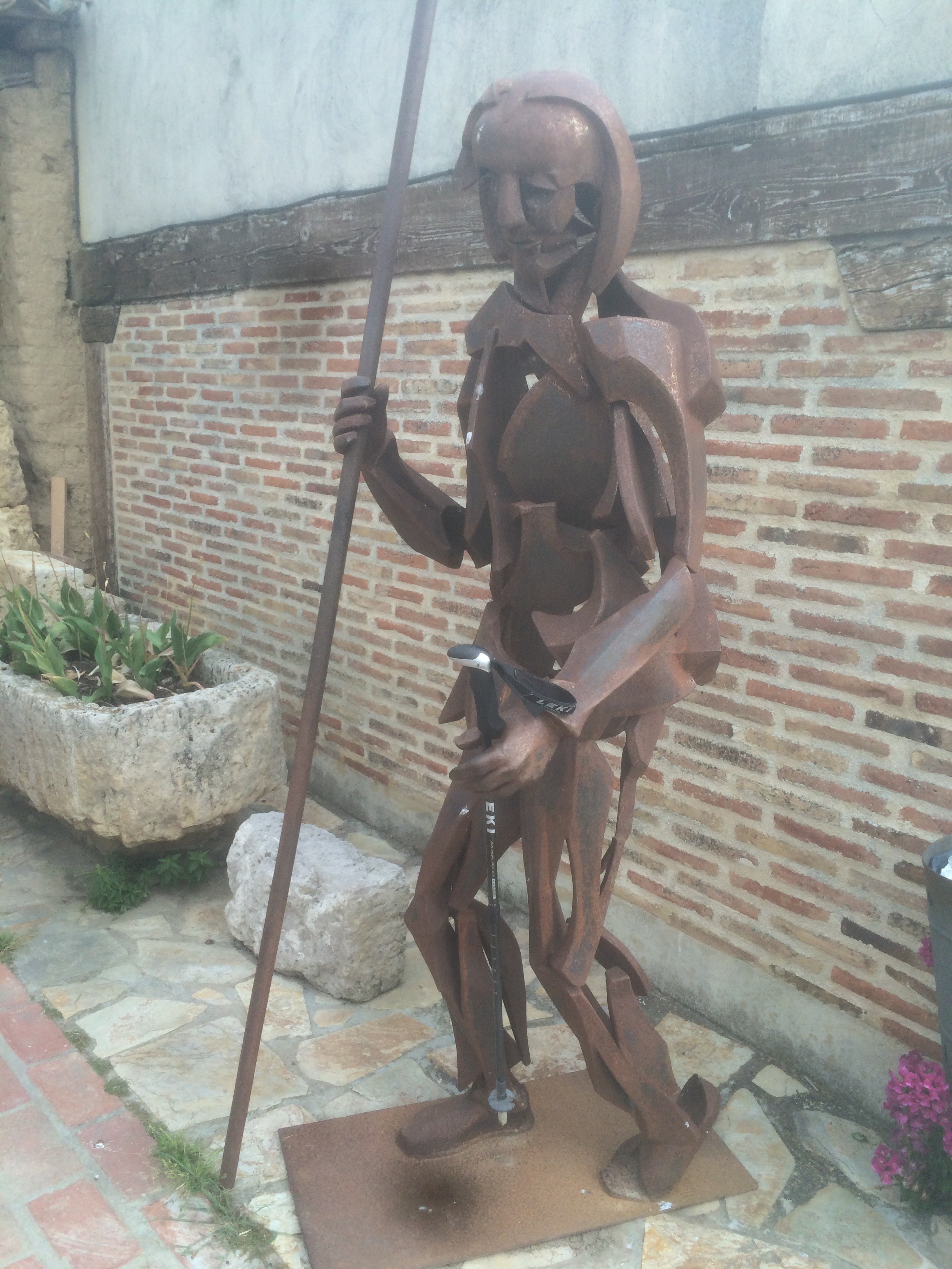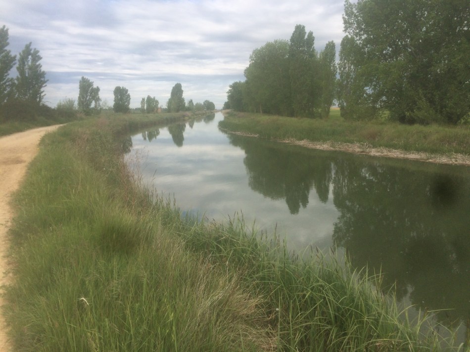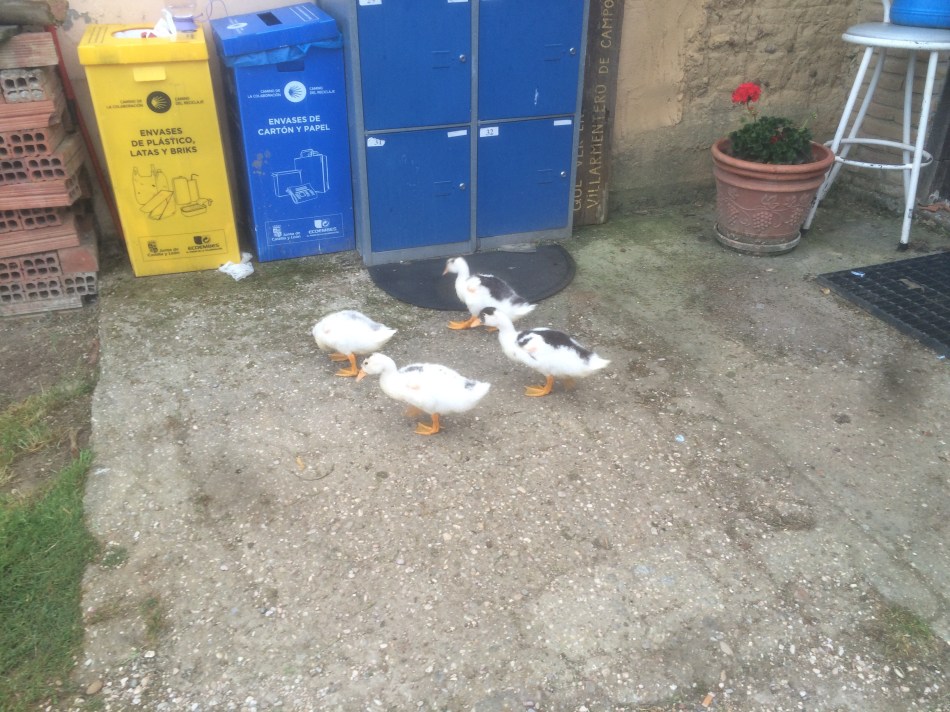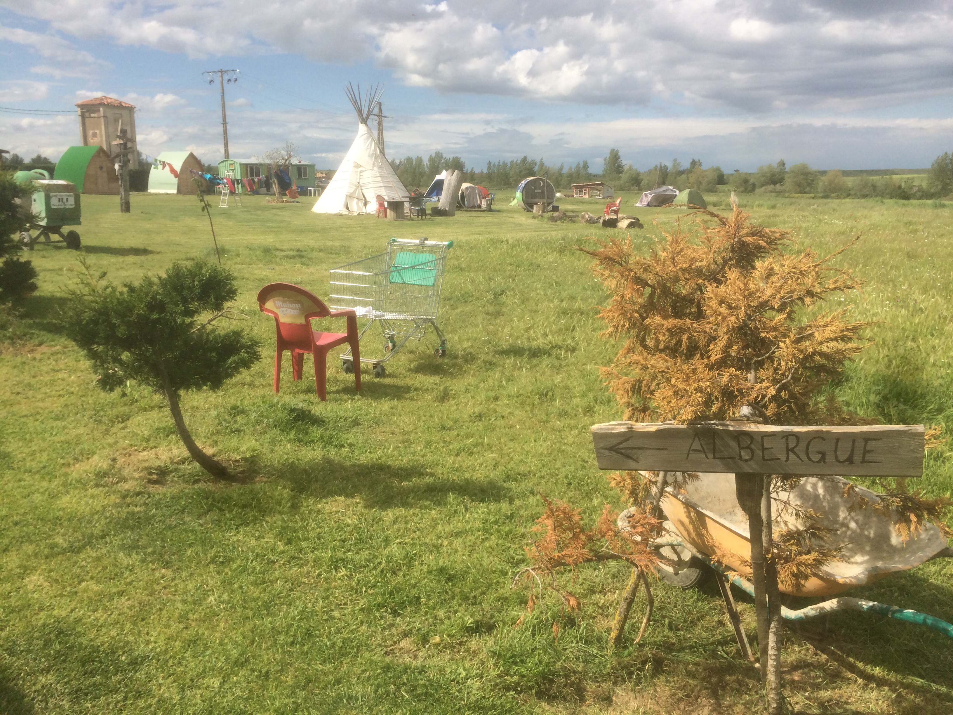 Yesterday’s slog continued for another unremitting 23 Kms to the village of Villarmentero de Campos and the Albergue which is stuck in 1972, Holland or Denmark. The staff seem to be pilgrims who have fallen in love with the place and stayed on as volunteers. Chickens and geese roam the gardens. Apart from the house, you can sleep in little huts, wigwams, caravans… The bar is playing Gregorian Chants of rock anthems and the walls are covered in graffiti.  Some pilgrims have arrived on horses. There is a legend of a young woman walking the Camino with her 3 year old daughter. Well, no surprise, she just arrived. She is at the bar ordering a vegetarian dinner.
