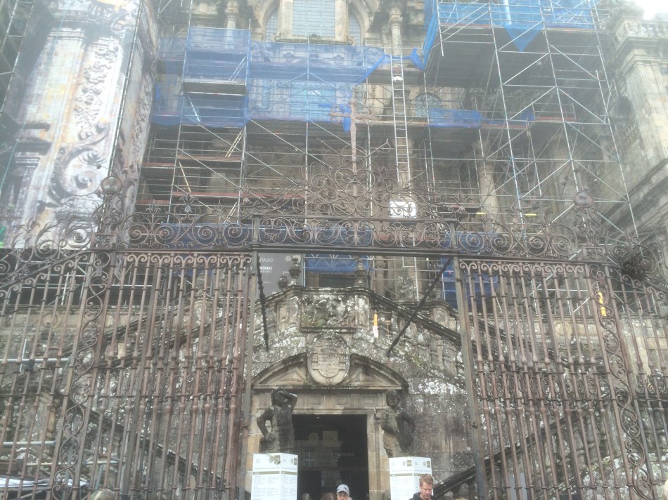 I told my feet to stop walking and looked up to admire the Portico de la Gloria. This is the doorway of the Cathedral in Santiago de Compostela, built in 1188 to welcome pilgrims to the final resting place of St James, the Apostle. Unfortunately renovation is underway so little to nothing can be seen of the Portico and you now have to enter the Cathedral via a side door.