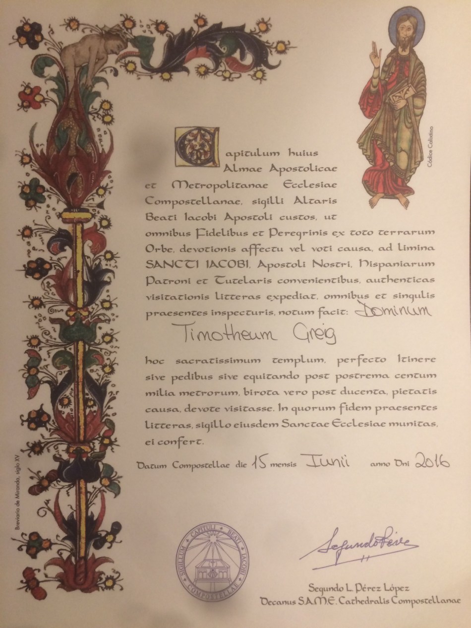 My first priority was to instruct the laundry service to restore my white shirt. I then visited the Pilgrims Office to present my credentials and was promptly awarded the Compostela. Here it is: