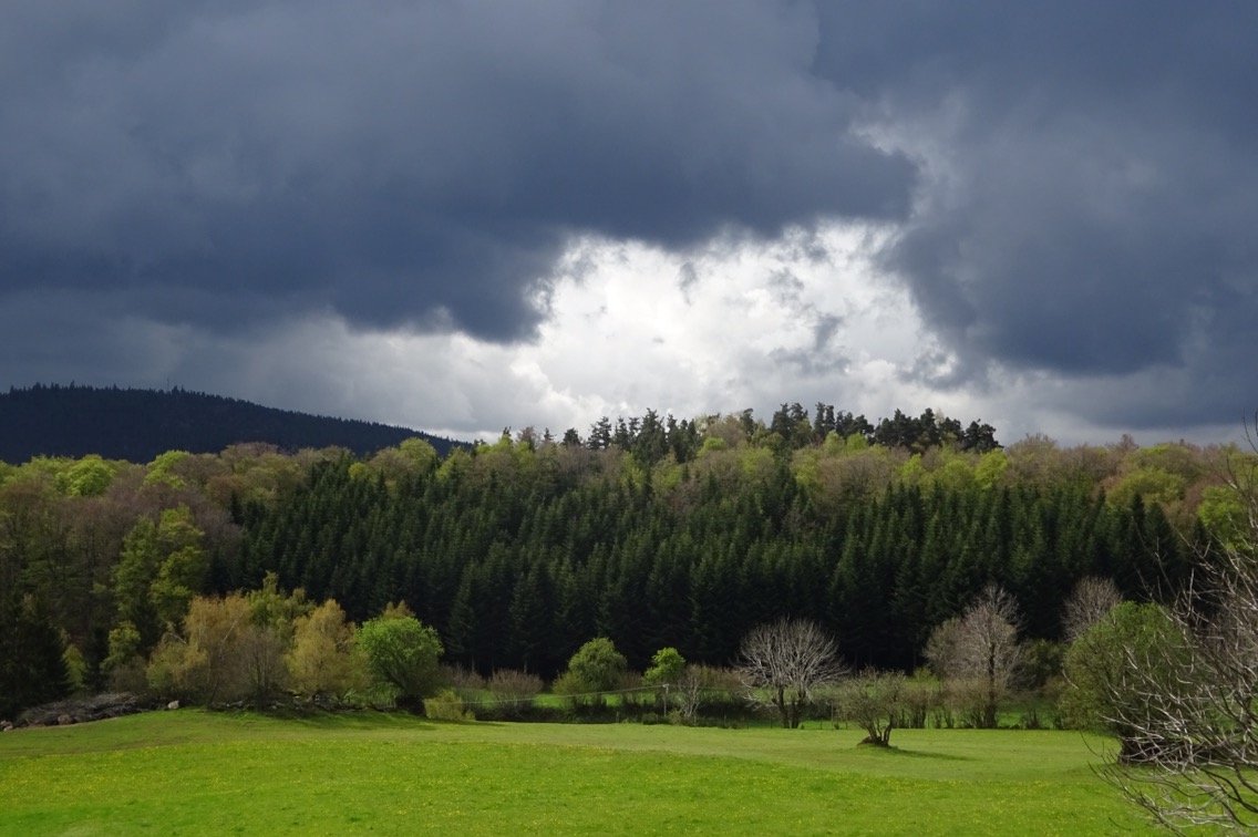 A maddening mixture of rain and sun today as we continued our walk over the Margeride hills and forests. We ate lunch in the garage of a farm house which had been converted into a humble cafe for passing pilgrims. All very rural but enterprising.