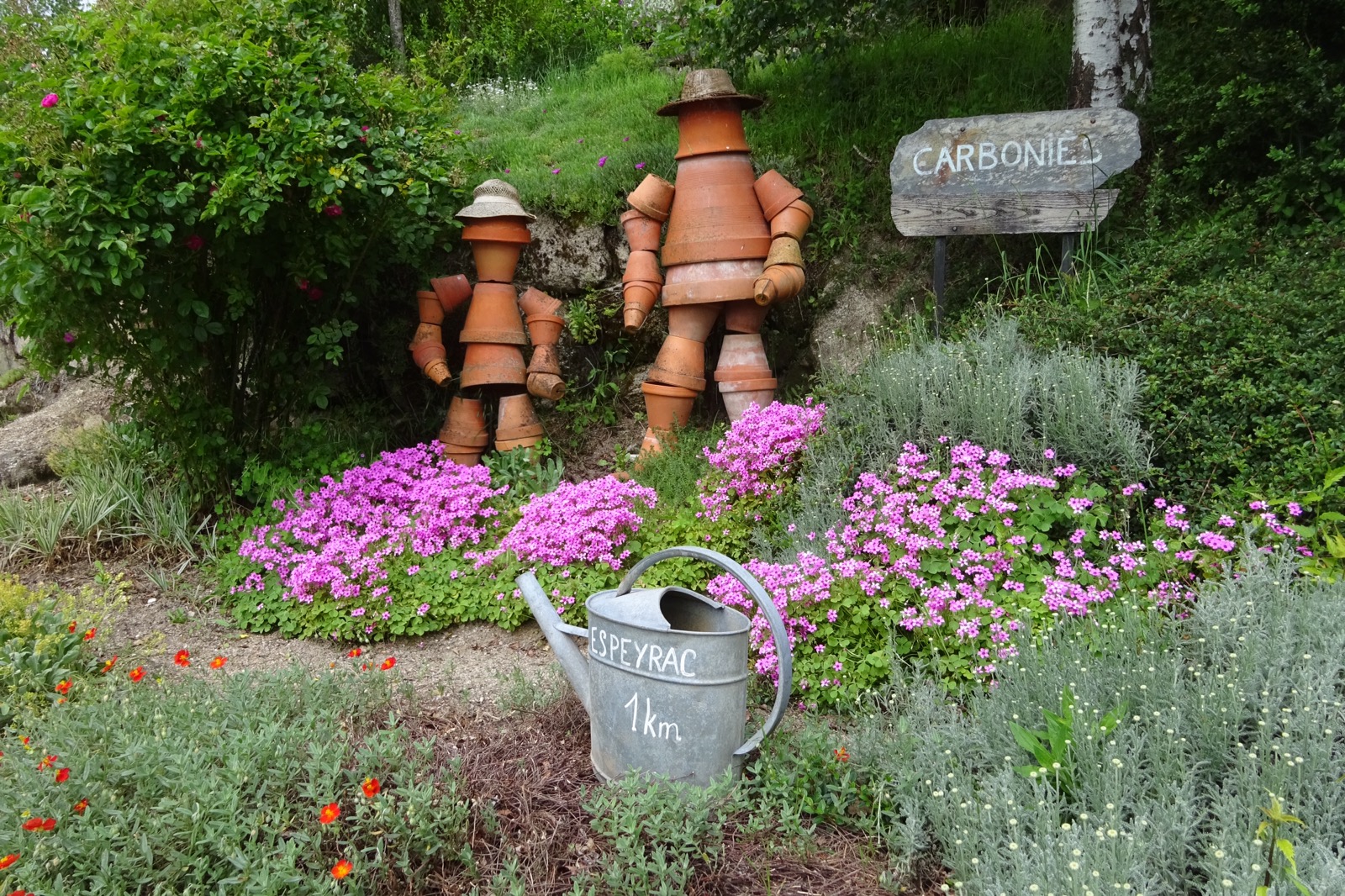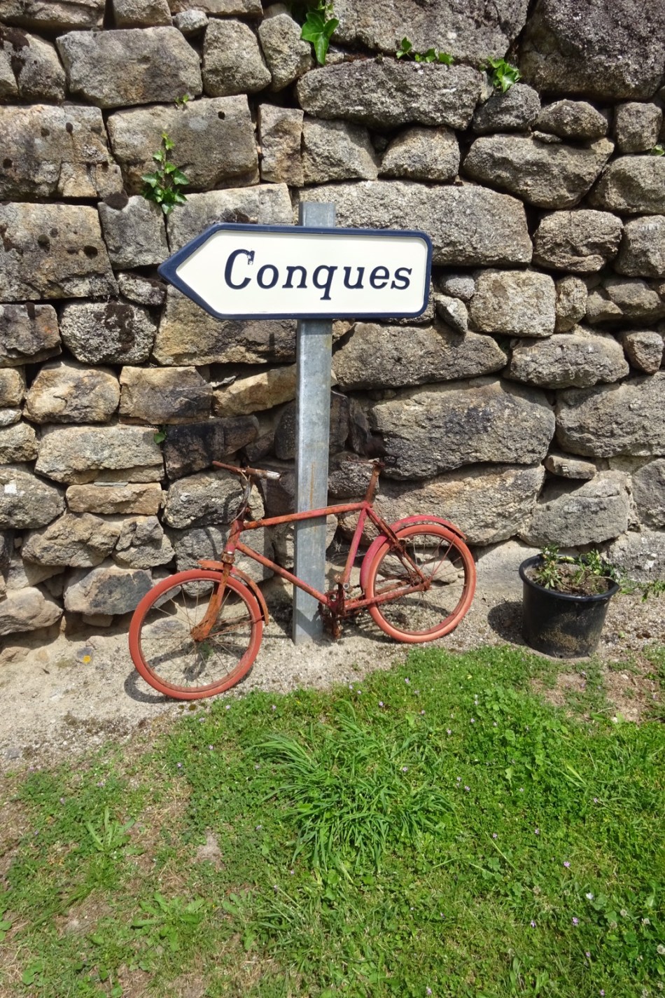 M Hulot led us to what would be described in a basic geography textbook as a cliff face and over we went. I would have photographed the descent if I wasn’t hanging on for my life. At the bottom we were met by a fast flowing river. We edged along the bank for a few hundred meters until a small road came to our rescue. At a junction, M Hulot announced there would soon be a cafe around the corner but I told “I” that I would not follow him another centimetre and we found our way back to the GR65.