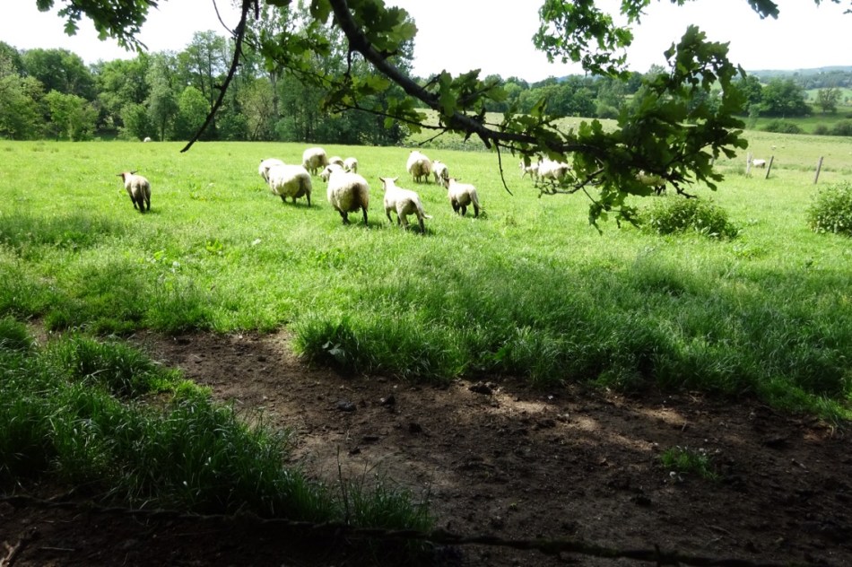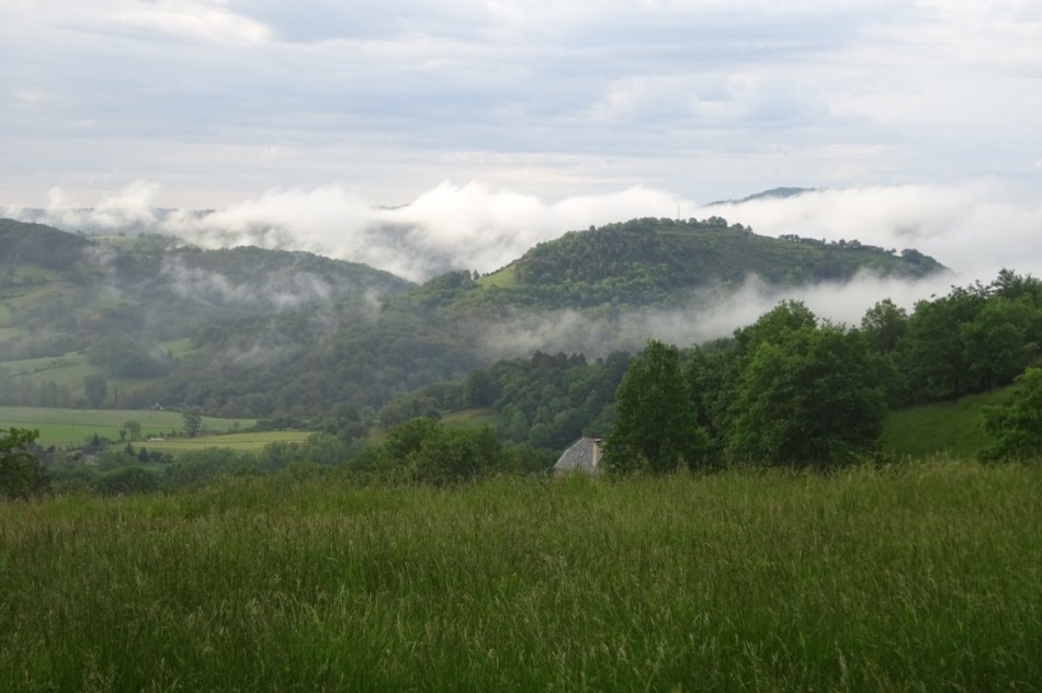 “I” can be forgiven for not concentrating fully on Madame’s 15 minutes welcome spiel last night. Madame had warned there was only one lunch stop today and “I” thought she said it was at Campagnac. So it was that when we approached the village of Campuac “I” suggested we sit in the muddy corner of a field to eat our cereal bar and drink our tepid water. In the background the farmer was spraying liquid fertiliser from a trailer behind his tractor and we just missed an early shower. Soon after that, we set off. I noticed a bar and boulangerie in the village but “I” assured me that we would eat well in Campagnac. Off we went.