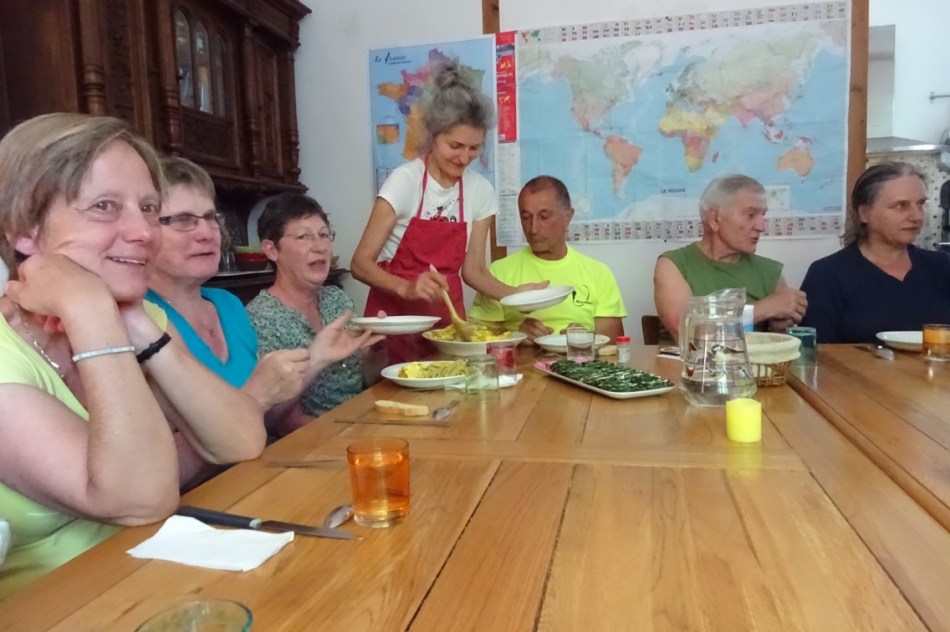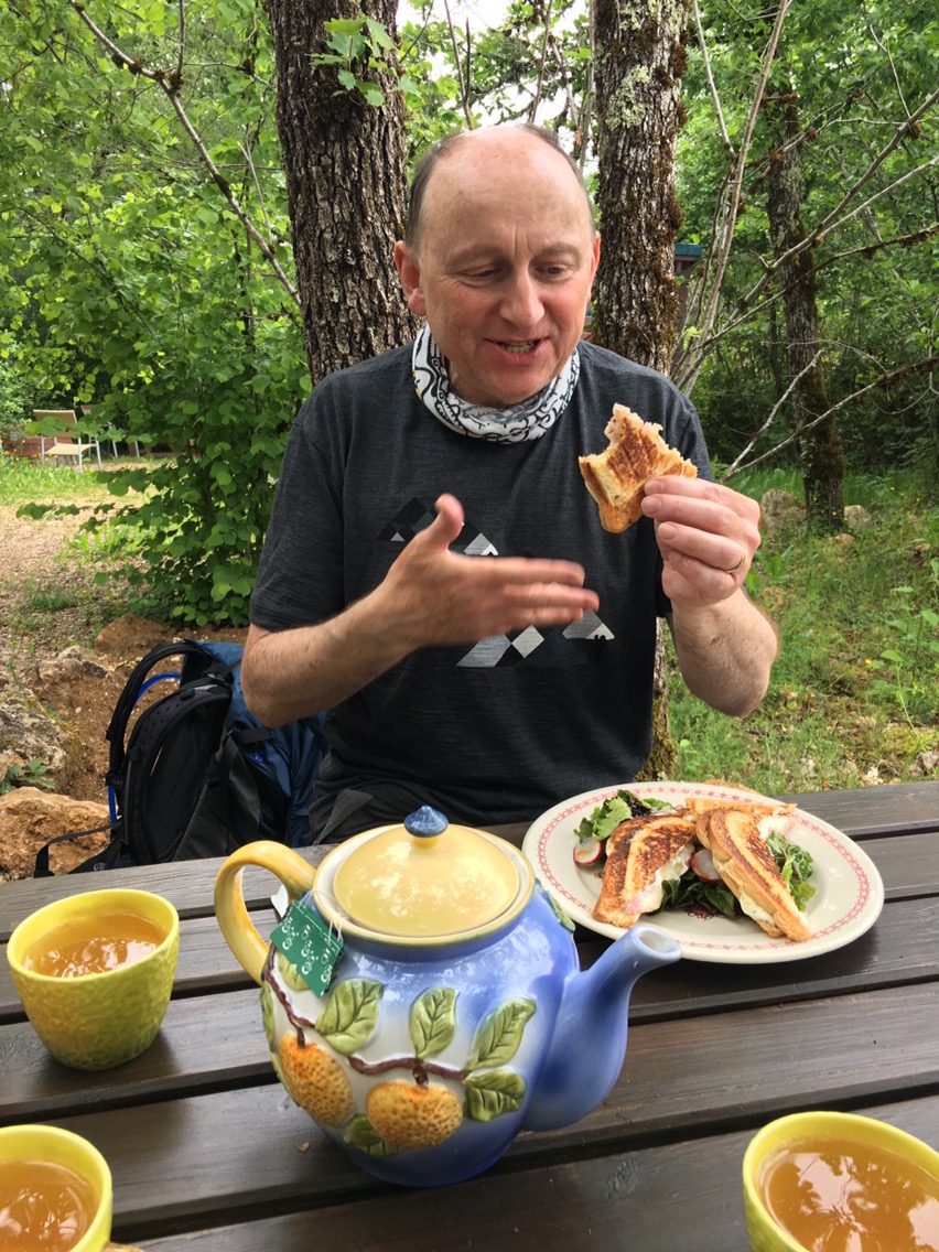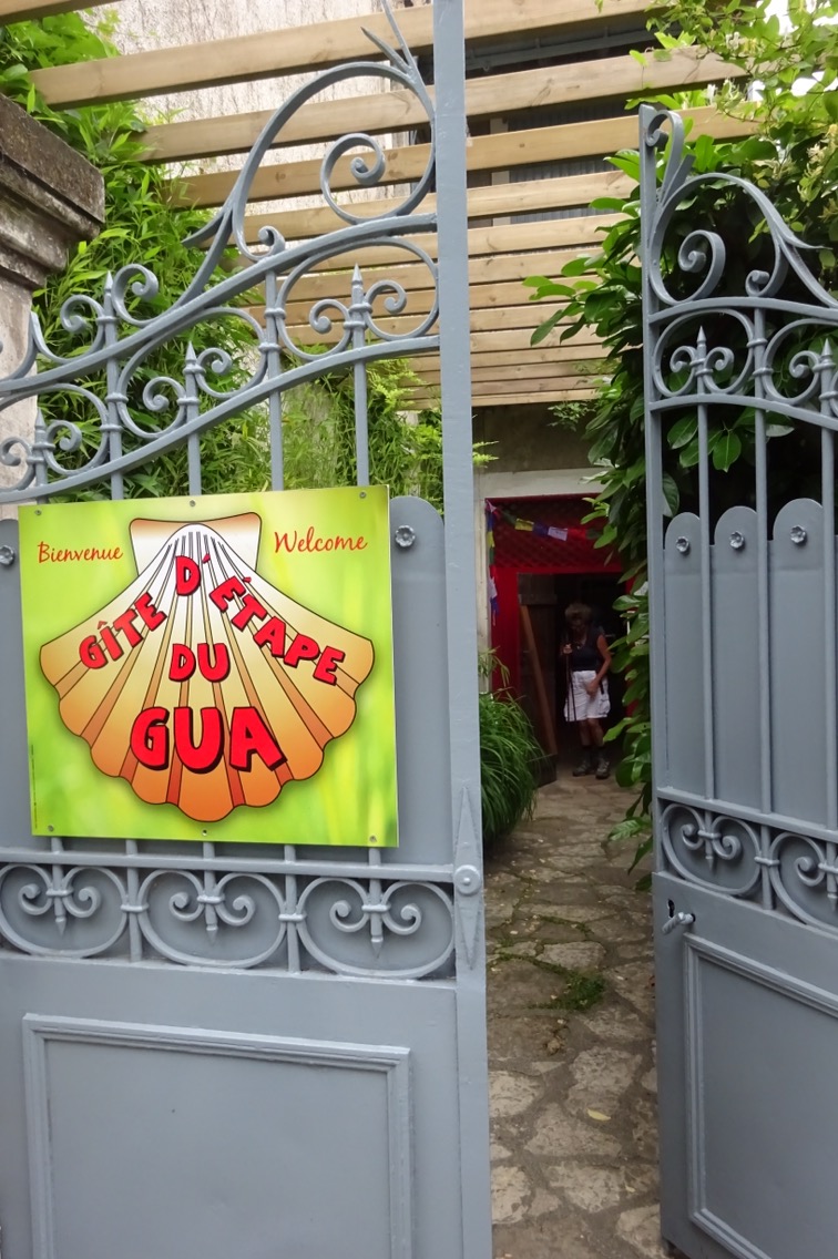Last night’s Gite Gua in Figeac was one of the best so far. Madame Frederique put her heart and soul into providing a very special stay. 15 of us sat around her table for dinner and she served a delicious dark green soup which we later discovered was nettle soup. She had picked the nettles herself in the morning. Next was an omelette, chips and veg for the main course, served from a huge oven dish. And then, best of all, real home made goats cheese. Chocolate fondant and ice cream completed the meal. Among the pilgrims was a Swiss couple, the woman actually being English born. So with some help and much encouragement I managed a little more participation in the conversation than normal. We agreed to walk together in the morning.