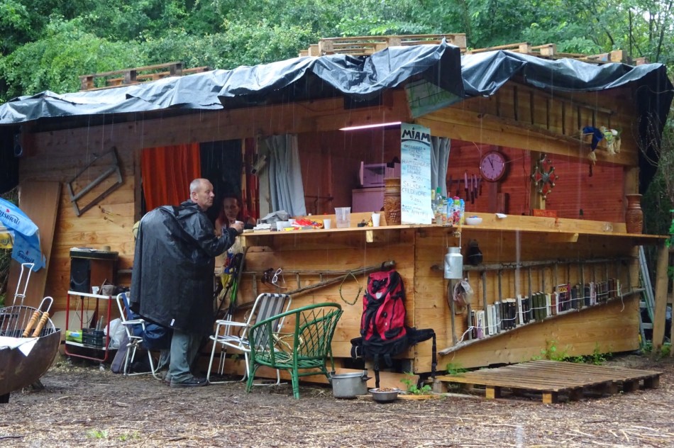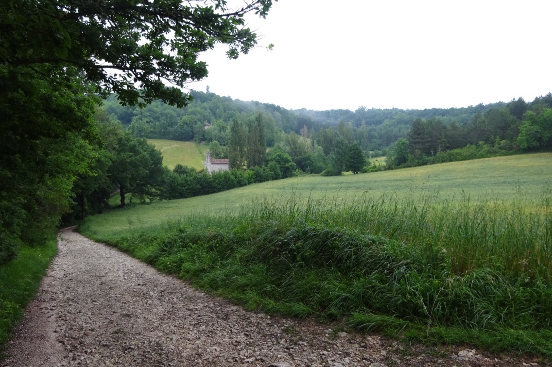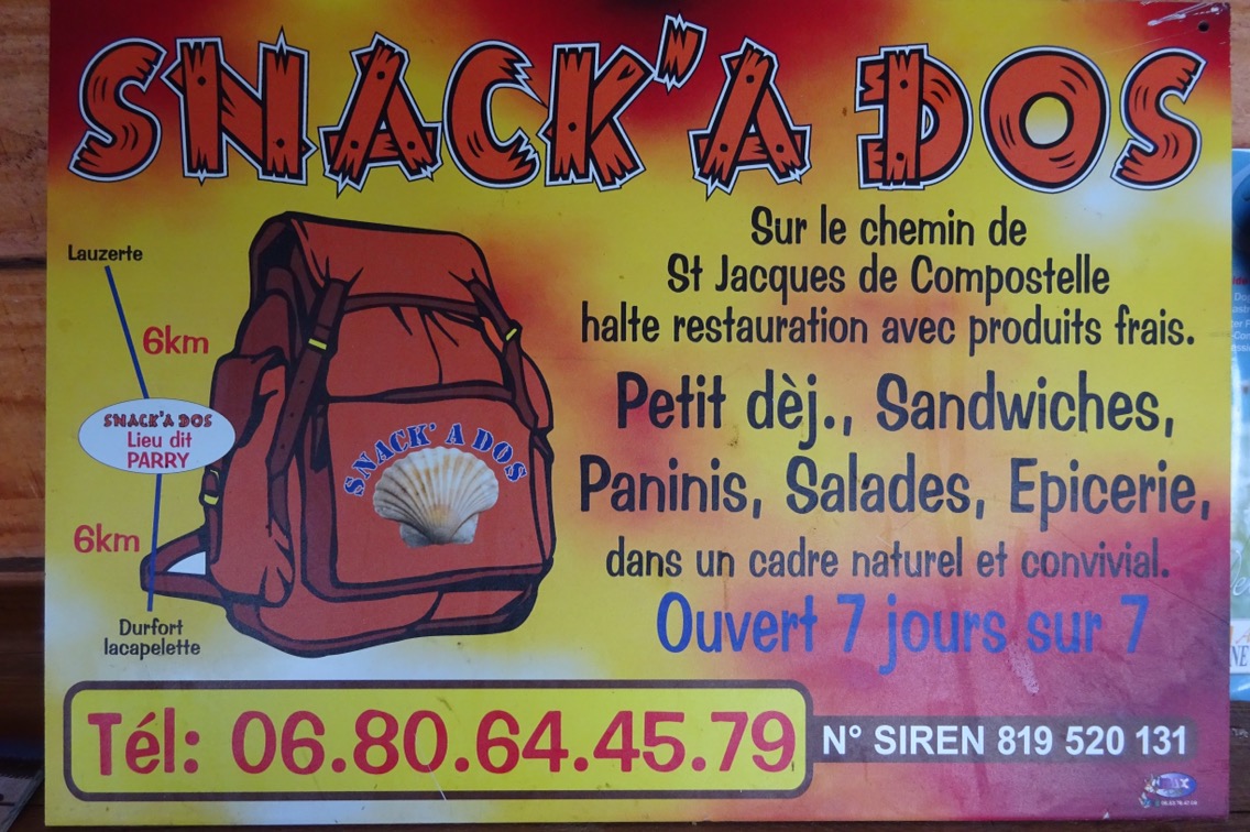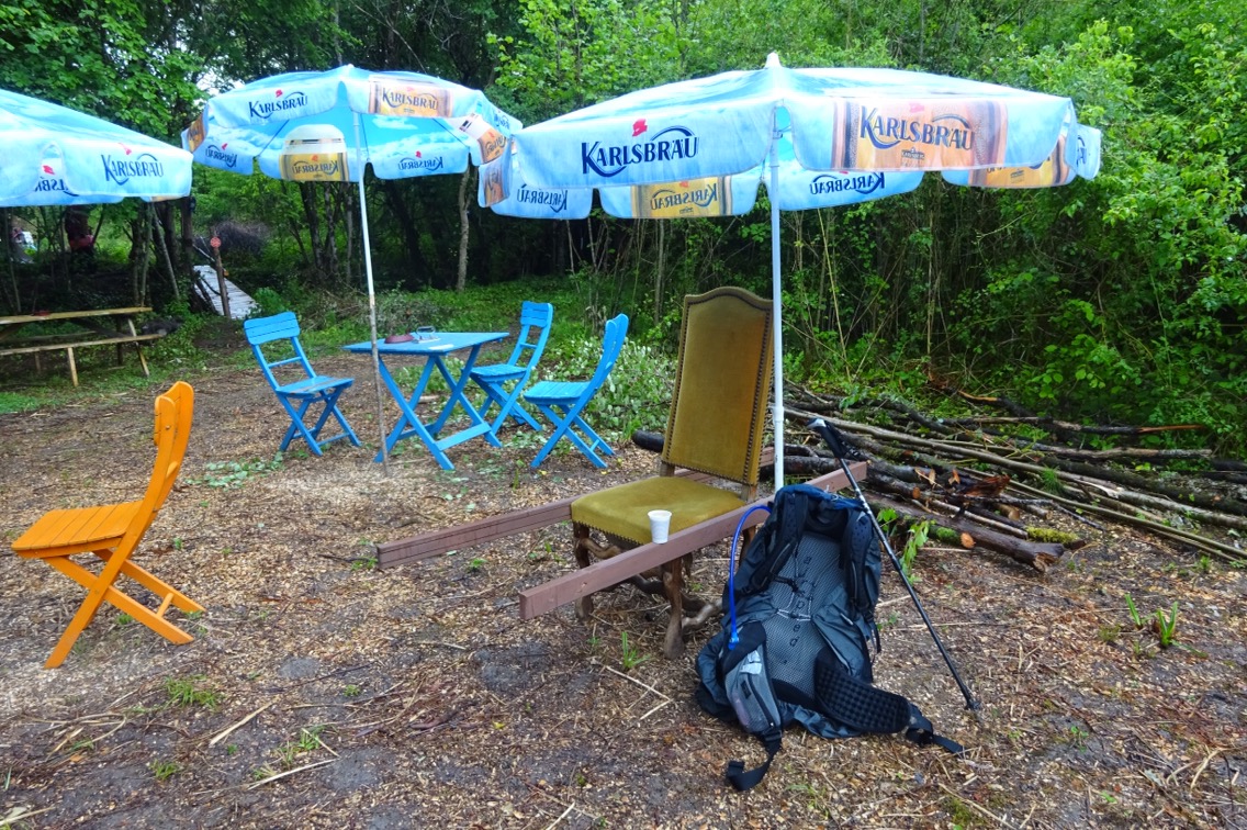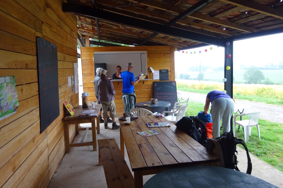 Despite the day’s gloomy weather I enjoyed a couple of rest spots which we take for granted in Spain but are quite rare in France. The first place was a hefty construction with concrete floor on a farm. I ordered my sandwich and a coffee. After about 18 Km I came to a sign in the woods which said Drinks 100m and this was soon followed by another one that said Oops, 400m. It made me smile. In a small clearing some young former pilgrims had set up a pretty rest space serving drinks and snacks. I ordered a coffee and sat down in a sedan chair hoping to be carried the rest of the way to Moissac. Most pilgrims walked through without stopping, probably due to the rain but I flagged C who is another Swiss pilgrim heading for Irun and pursuaded him to take a rest day with me in Moissac tomorrow.