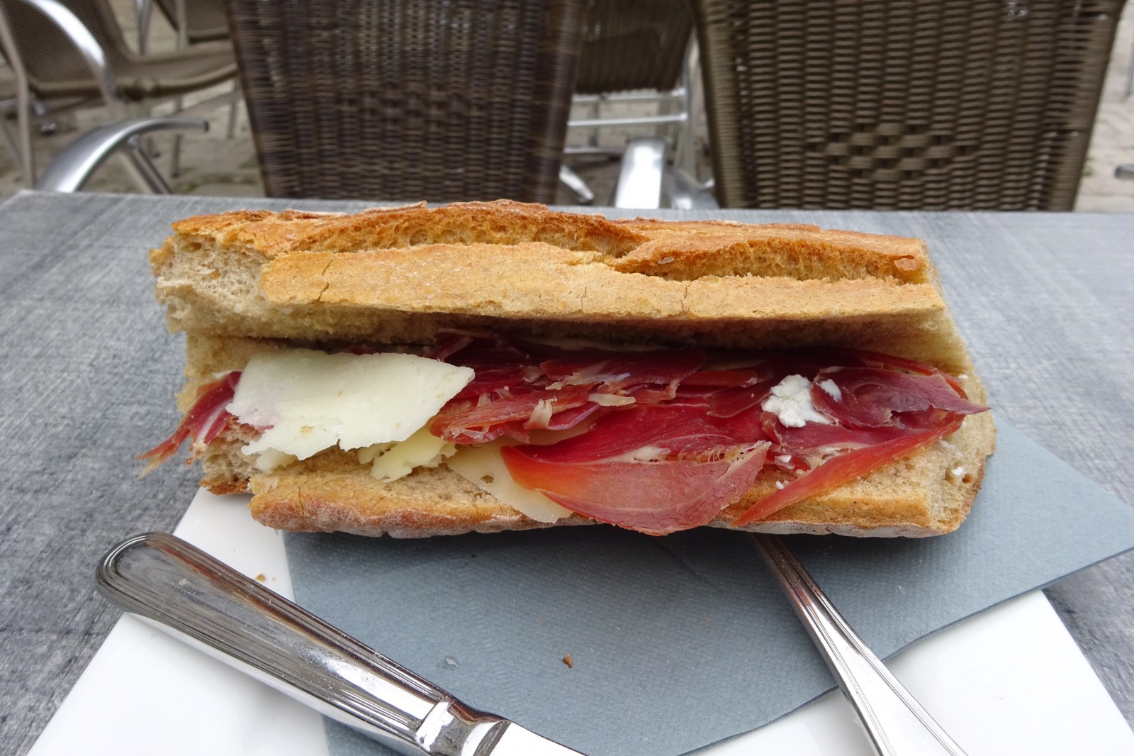 My intended gite in Eauze was in the middle of a demolition site; only the gite itself was still standing. There was nobody about, just a note on the door to call the Madame. I called and cancelled. Staying alone in such a place didn’t appeal at all. My attempts at getting lunch also led to disappointment. The boulangerie had just run out of sandwiches so I sat outside a cafe in the main square and ordered a beer and sandwich. The sandwich was inedible (see photo). The bread was stale and had been warned up. A little dried ham and cheese were spread out inside. No butter, salad etc. I refused to pay for it. At that point the chef came out saying he had personally made the sandwich using local cheese and had put all his love into it. I told him it was horrible; quite the worst sandwich I’d ever seen and truly terrible. After some minutes of this diatribe he said goodbye. I picked up my pole and walked straight out of town.