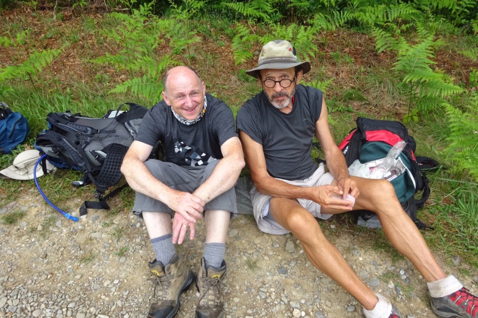 The Monsieur at last night’s gite announced the menu just before dinner. The main course was duck. Duck makes me sick. I asked him if he could cook me an omelette and he duly obliged and I enjoyed it. I then performed my pilgrim duties and dealt with P’s blisters. I might just as well have eaten the duck. Anyway P was so thrilled that he joined Fr, N, E (a new German) and me on the walk to Lichos today. And we collected Co (the pilgrim who fell out of bed) along the way to make a formidable group.