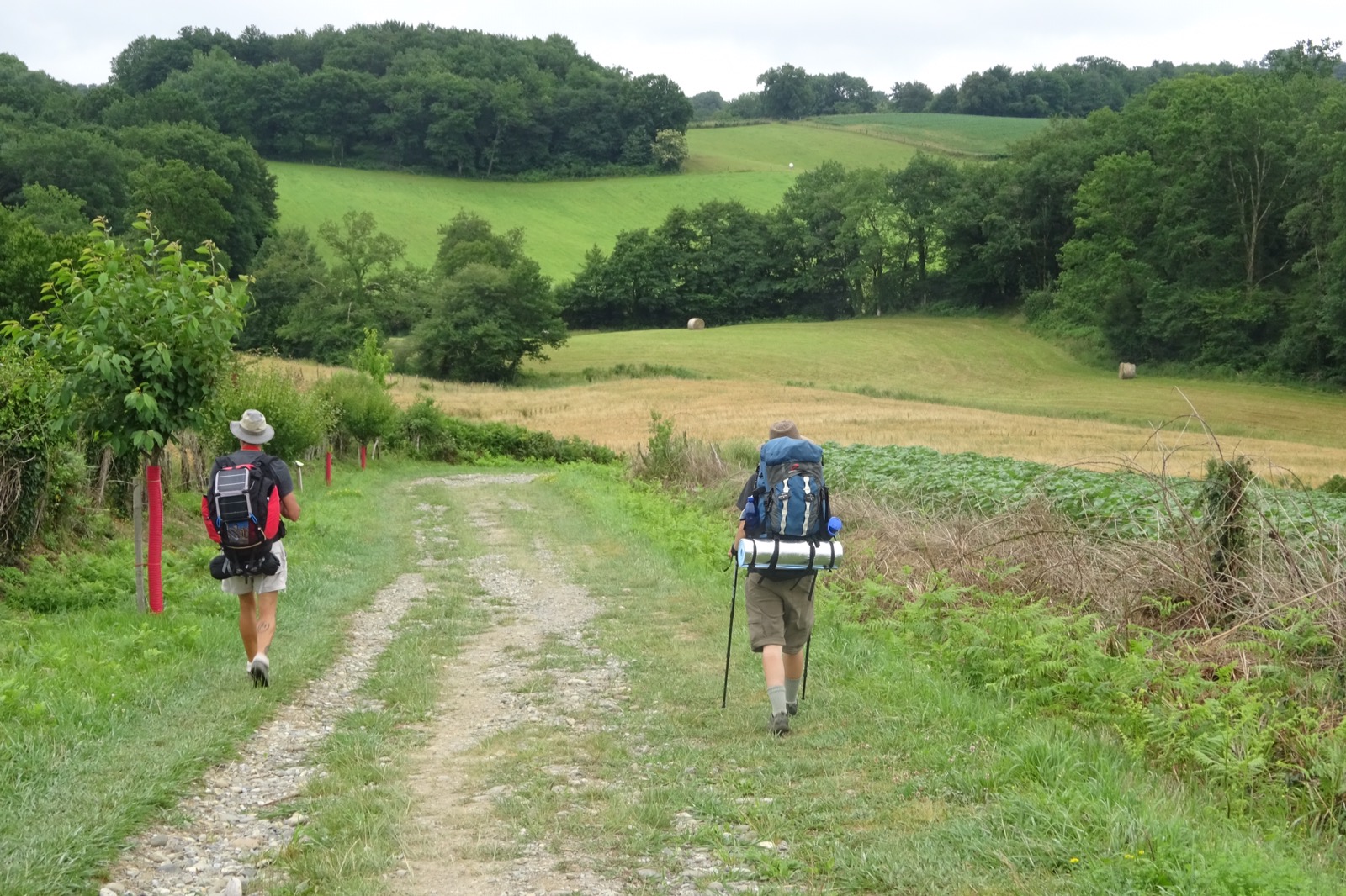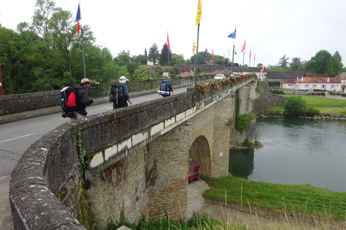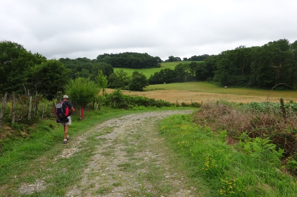 We stopped in Navarrenx for a coffee at a smart cafe which was heavily branded with Camino images and pilgrim menus. However the welcome was mediocre. So we left town and continued along the roads and into more woods and the Basque Country. It was another 29Km walk but we were rewarded by our first sighting of the distant Pyrenees.  St Jean PdP is now just 50Km away. We’ll walk another 30Km tomorrow (Friday) and I’m staying on a farm where I’ll be reunited with C, my walking companion for the days until Condom. If everything works out, I should be able to lead quite a sizeable group into SJPDP on Saturday, rather like Charlemagne. Except my boots are disintegrating and my pack is falling apart.