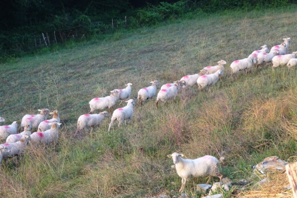 Sheep having an early morning run around on the Ferme Gainekoetxea