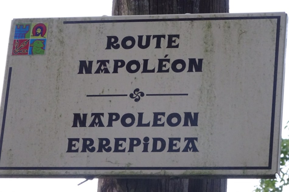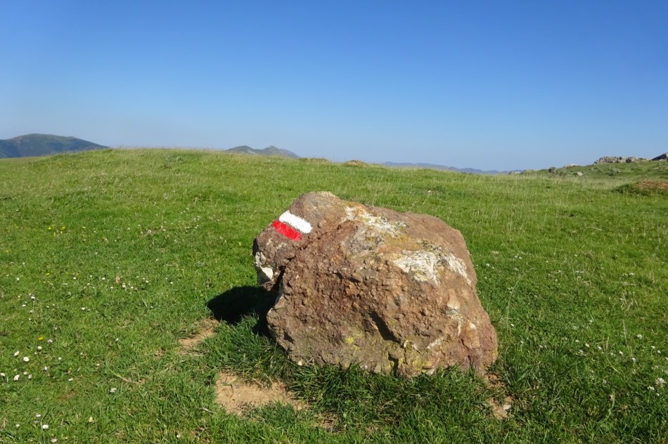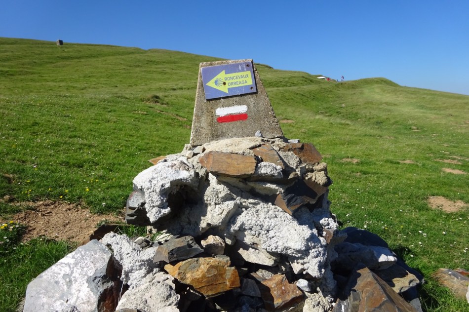 This morning I met N and M at 6.00 outside the baker and after a pain aux chocolate we set off in a generally upward direction following the usual signs and the pilgrims hoping to beat the 36 degrees forecast later in SJPDP. The old GR65 signs which guided me all the way from Le Puy were now competing for prominence with the yellow arrow of the Camino Frances but navigation was predominantly “follow the person in front”. The new pilgrims looked happy when passing the signpost to Compostela showing 765 Kms but I know they will be suffering badly by Pamplona.