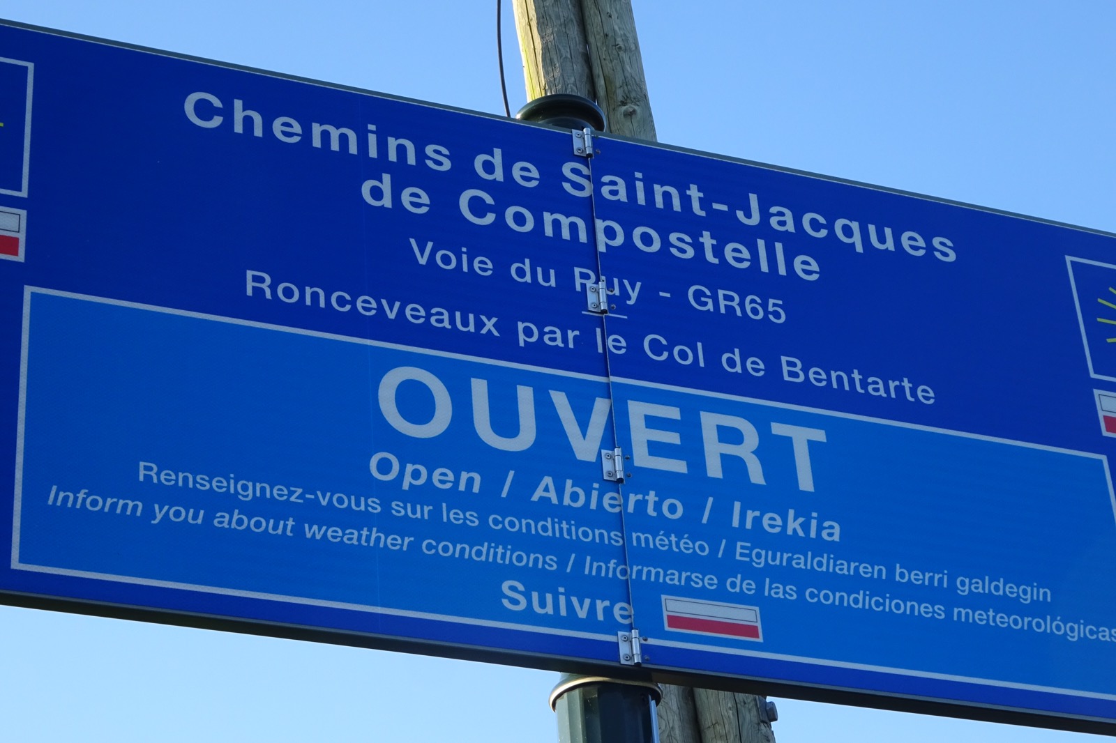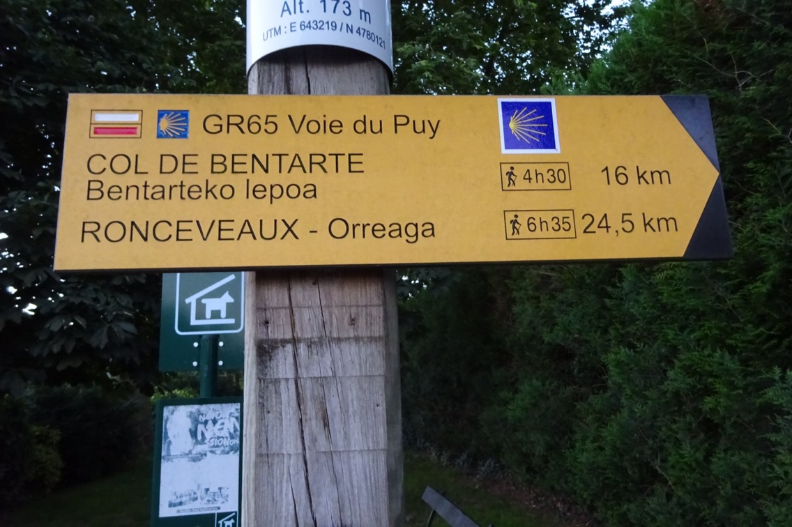 This morning I met N and M at 6.00 outside the baker and after a pain aux chocolate we set off in a generally upward direction following the usual signs and the pilgrims hoping to beat the 36 degrees forecast later in SJPDP. The old GR65 signs which guided me all the way from Le Puy were now competing for prominence with the yellow arrow of the Camino Frances but navigation was predominantly “follow the person in front”. The new pilgrims looked happy when passing the signpost to Compostela showing 765 Kms but I know they will be suffering badly by Pamplona.