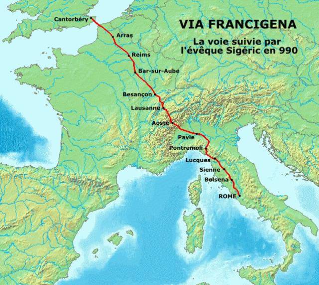 The Italian stage begins with a 1890m descent to Aosta and the walk along the valley with its irrigated farms and hilltop castles. It leads to Vercelli where the route enters Lombardy and the Po Valley. We will need a day or two to enjoy Pavia before approaching the foothills of the Appenines and the steady climb up to Passo della Cisa (1040m). This is the gateway to the volcanic hills and thermal springs of Tuscany and the towns of Lucca, San Gimignano, Siena and San Quirico before the Via Francigena finally approaches the Eternal City of Rome.