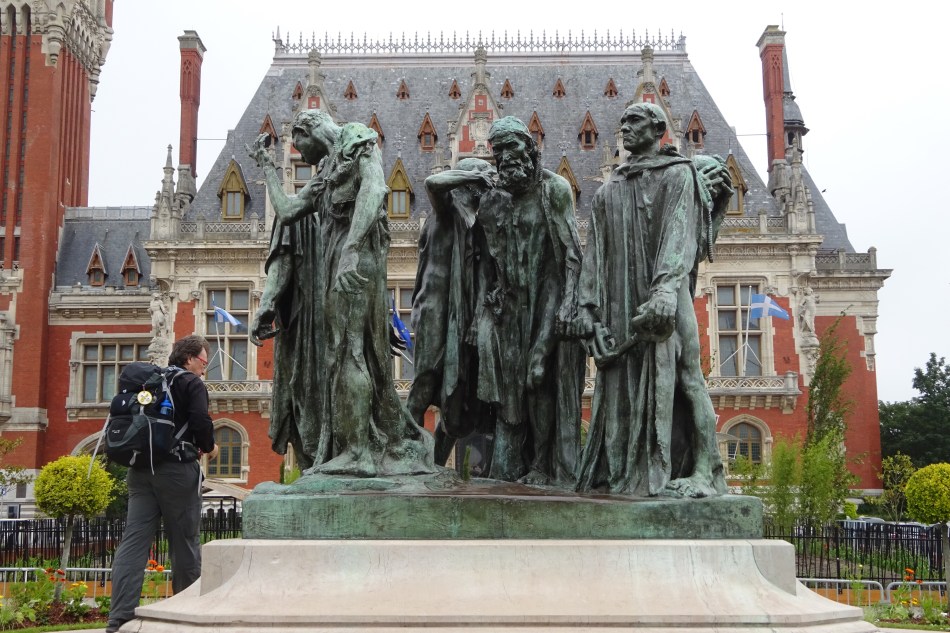 French immigration welcomed us in Calais (but for how much longer?) and then our troubles began. Channel ports are not designed for disembarking foot passengers and we went the wrong way across hectares of unused car parks and kilometres of very high security fencing. Eventually we were forced back to the starting point and out into Calais itself. Paul had expressed an interest in seeing a statue in the town and so we trekked around town until we found it. We then returned again to the harbour to start our 20Km walk to Wissant at 4pm.