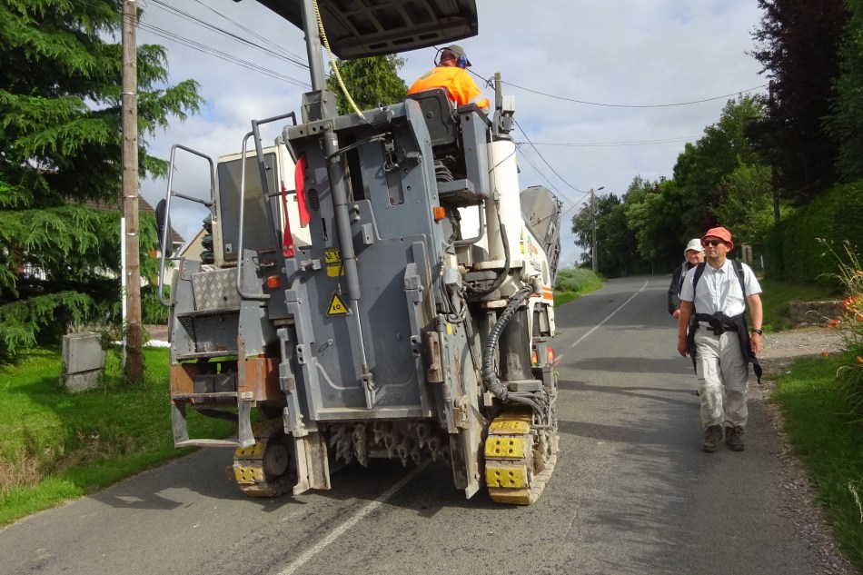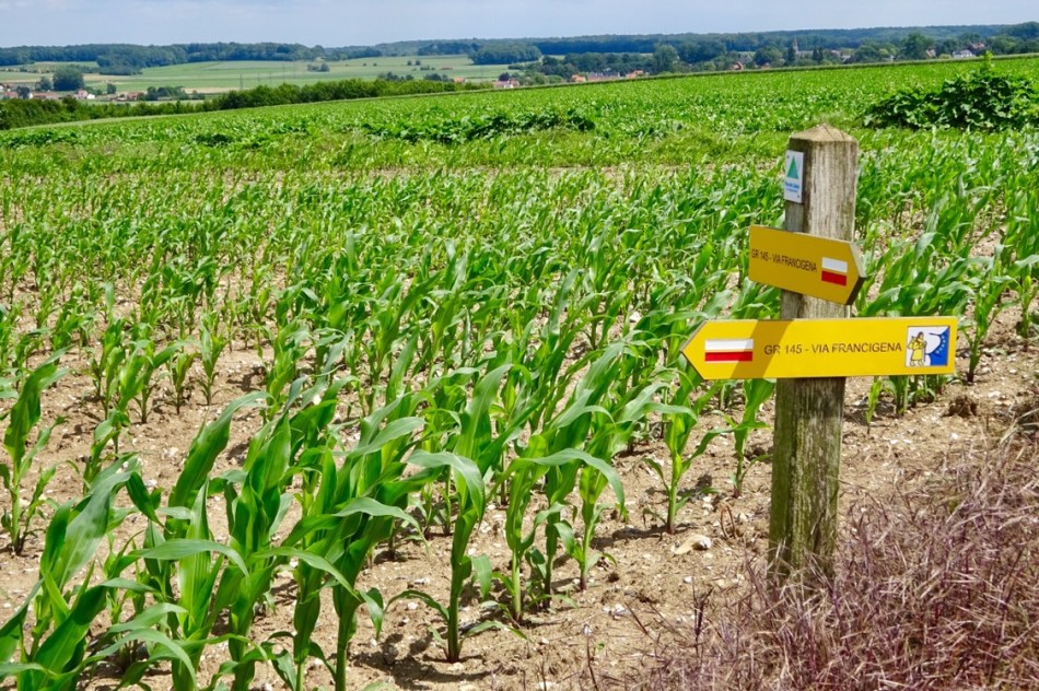 Claude walked with us for the first few kilometres this morning to point us in the right direction. We made a reasonably early start after a sumptuous breakfast. Marie made our picnic lunch (ham & cheese baguette). Later, she was waiting with her car in the middle of a wheat field to bring Claude back home and to wish us well. We said our farewells and headed off, bearing east-south east.