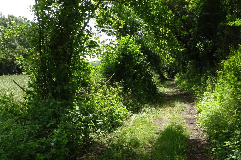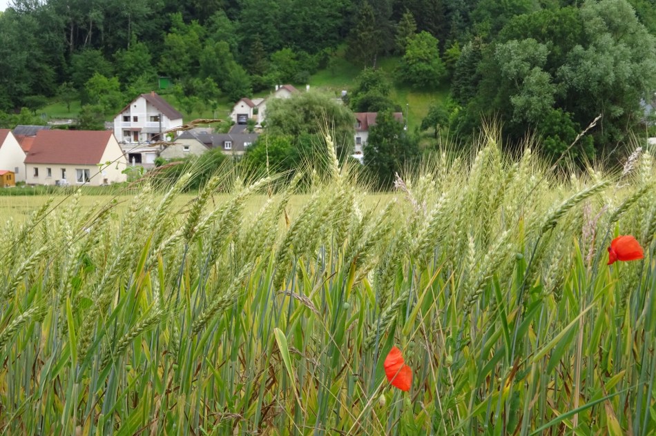 We actually had a pleasant walk today over the hills of Picardy, picking the cherries hanging from every wayside tree and photographing the poppies. We cut across farm tracks marked “Chemin private” and followed little streams gurgling through the pastures. We stopped in a village called Bruyeres et Montberault (2 villages) and I inspected the sophisticated coffee machine behind the bar. I ordered a cappuccino but it tasted like a British Rail coffee from the 1970s. But we had more luck next door in the boulangerie. I asked for “sandwich” Young mademoiselle immediately suggested “poulet” so with that as a starting point she gradually assembled our lunch baguette and when she suggested mayonnaise I said “non” to avoid the whole thing turning into egg mayo by mistake. It was as good as anything you’d buy in Pret and we had plenty of good fruit too.