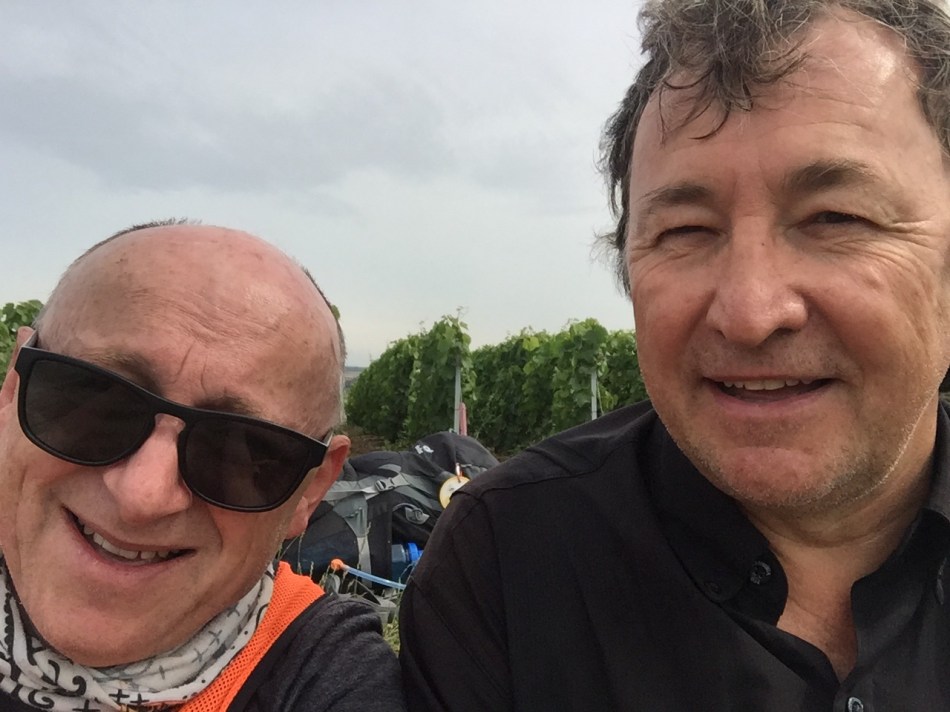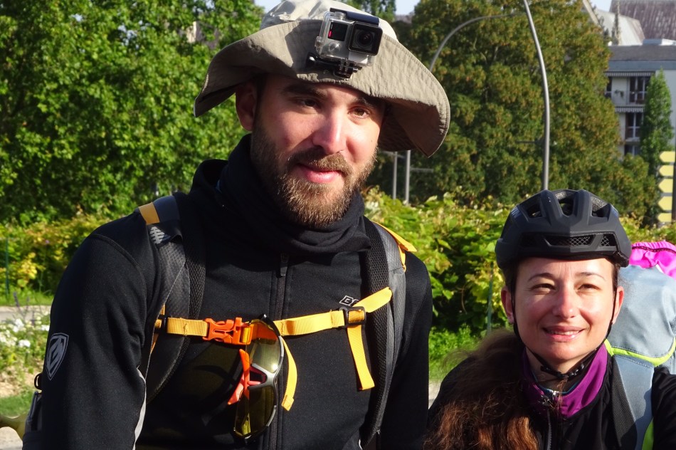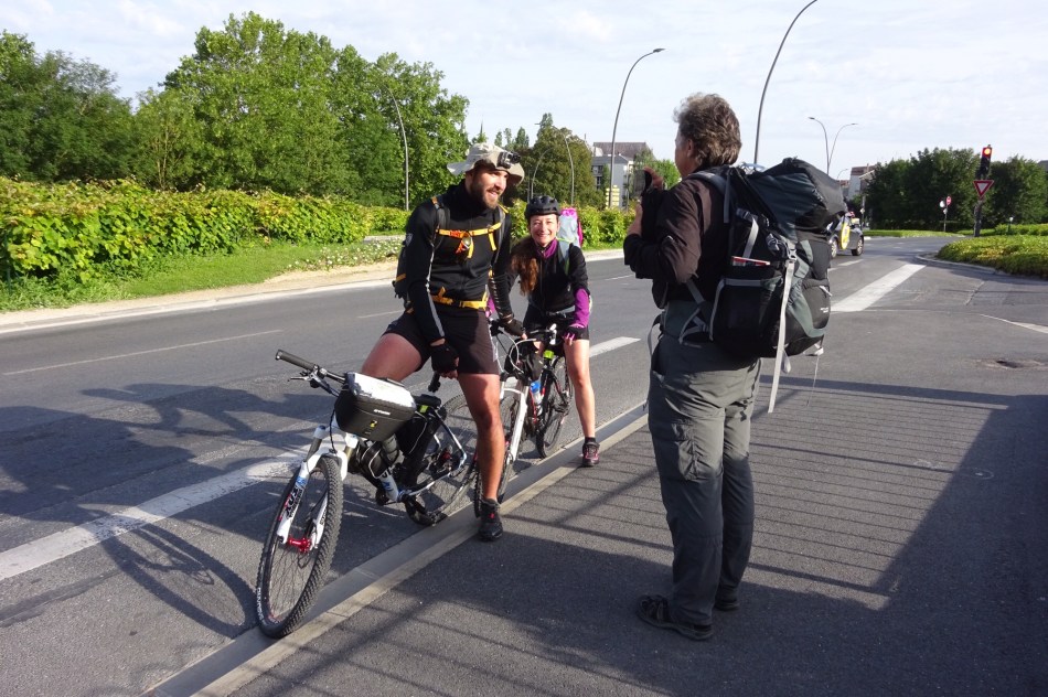 Paul wins the prize for spotting the first pilgrims to Rome. We were on the outskirts of Reims early this morning, just negotiating the Veuve Clicquot interchange, when he spotted them: a young Portuguese couple, Diego and Sandra, on bicycles laden with pilgrim paraphernalia. He was leading with go-pro camera mounted on his helmet, iPhone on his handlebars and scallop shell on his backpack. She was following with another backpack.