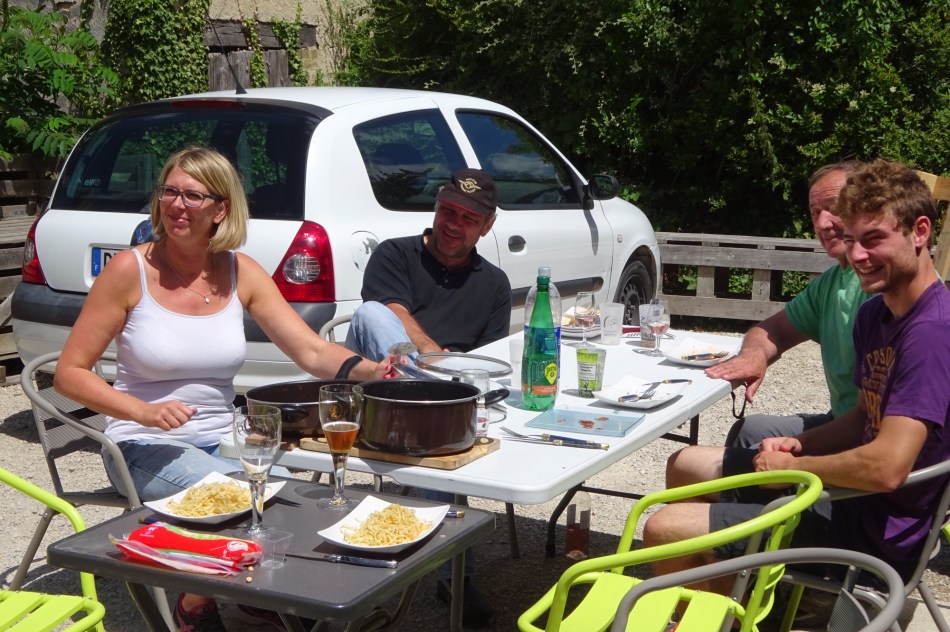 My plan at this point was to grab a chicken and barbecue it in one of the village gardens. But all at once Paul’s nose twitched and he set off around a corner and along a narrow alley. At the end was a small industrial unit housing a craft beer brewery. The small workforce were eating lunch outside, spaghetti bolognese with rose wine. These lovely people (the brewer Jacques and his sales director wife Natalie) invited us to join them and to sample the beer. Here was another story of the Camino providing.