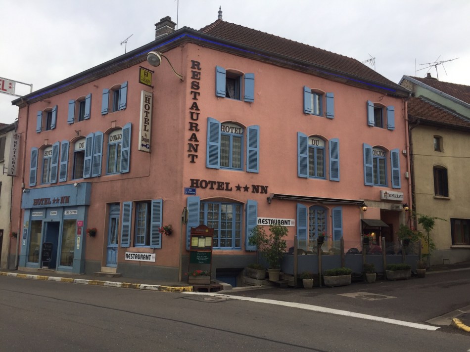 We checked into the only obvious hotel in Champlitte (Hotel Du Donjon, 53euros the room). It’s nicely located on the narrow road, along which giant trucks pound through the village, inches from our bedroom. Bring on the football.
