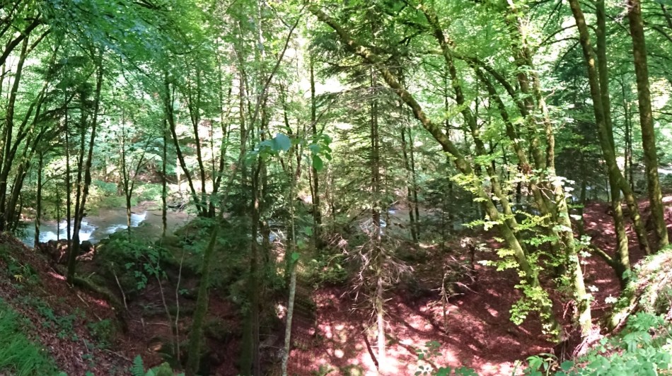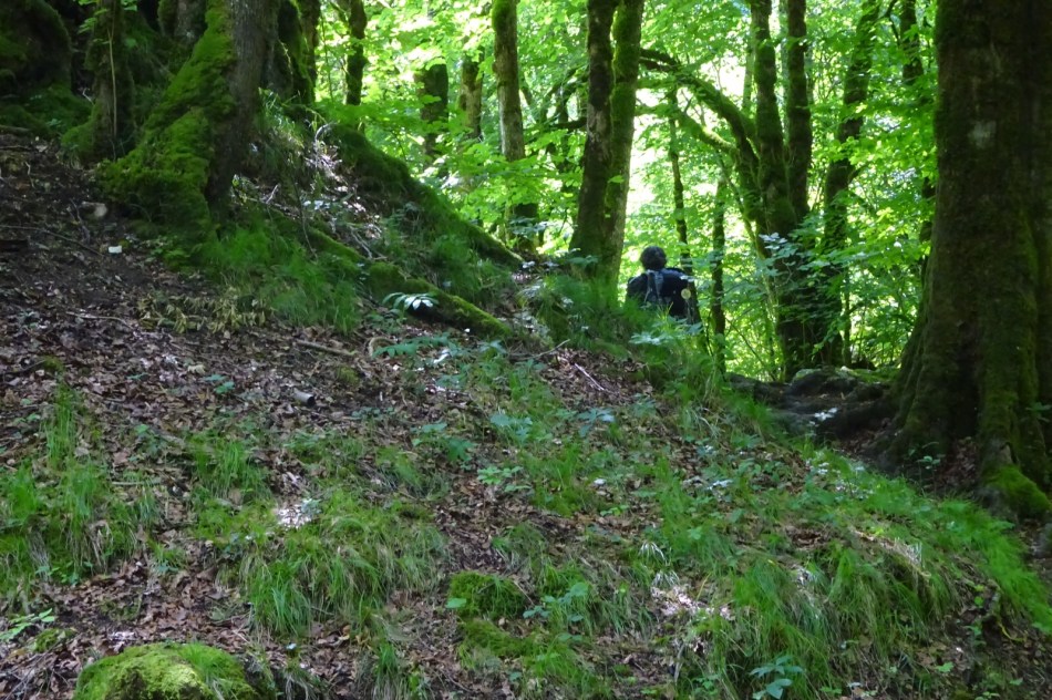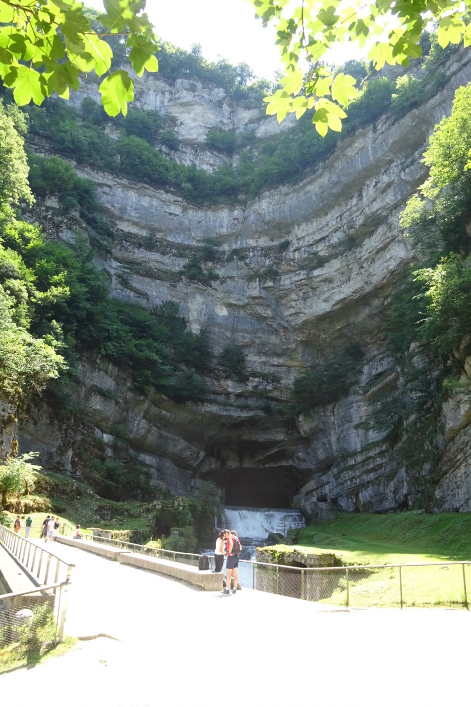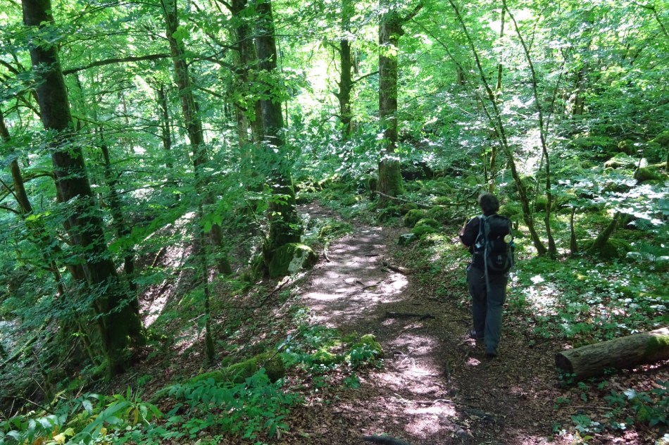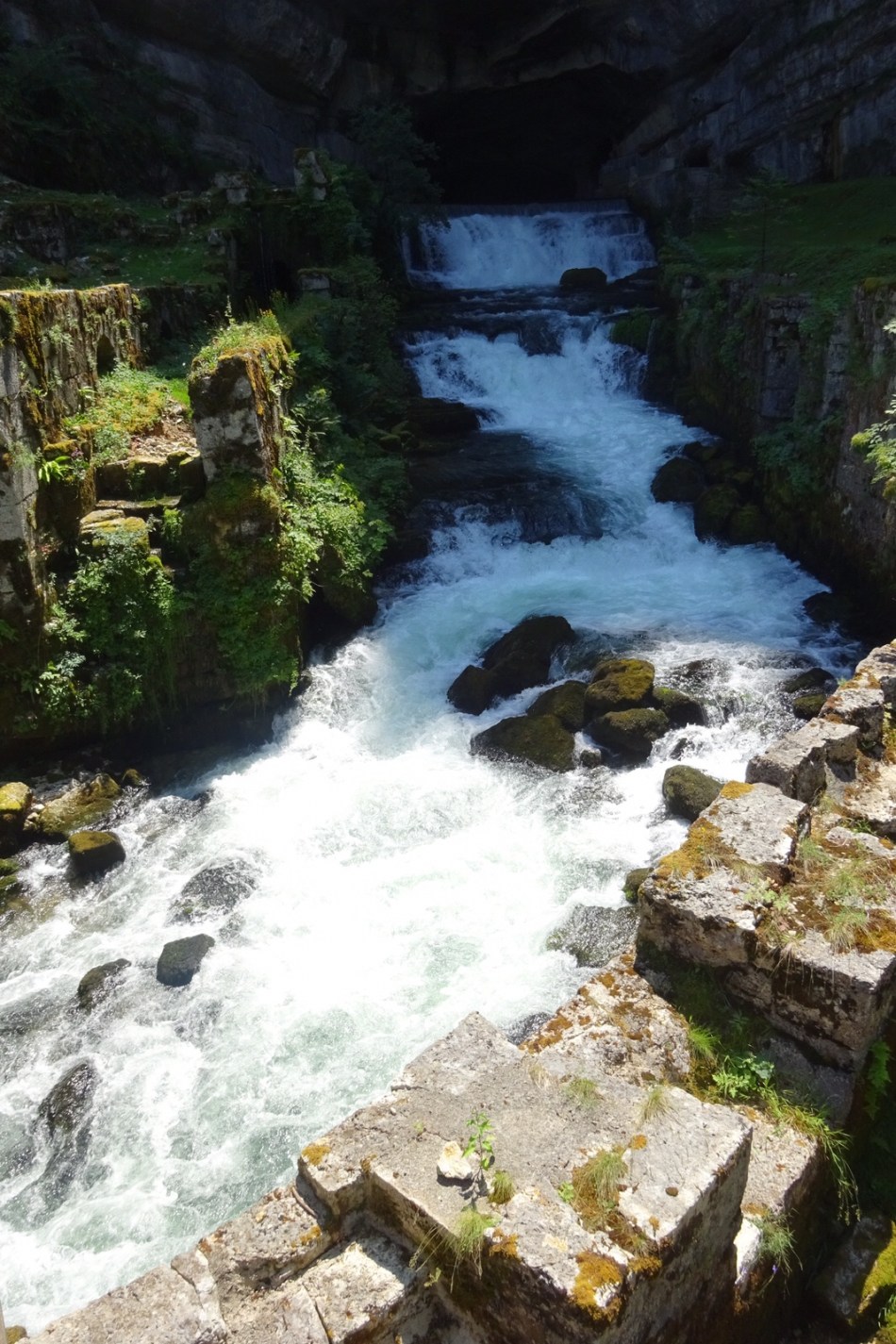 We had another excellent day’s walk, even better than yesterday. Initially we followed the Doubs river from Ornans to Lods where we stopped for another breakfast. Our climb into the Jura started. Now we followed the Loue past cascading waterfalls to its source. It was a lovely woodland walk for a Sunday morning. In the last village before the wilds I bought a lump of dough in the grocer shop which I ate along the way. What was the likelihood of a restaurant at the source?