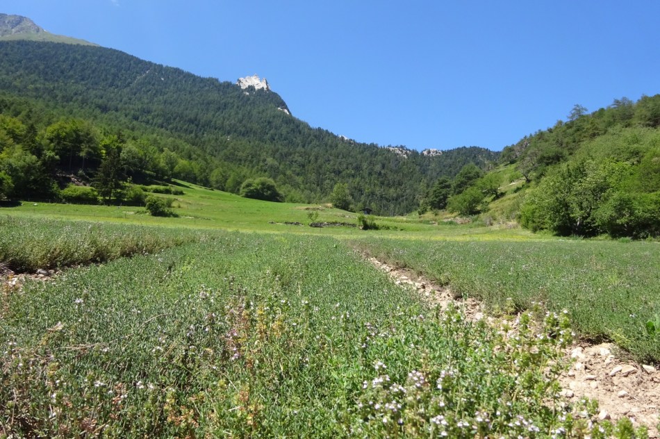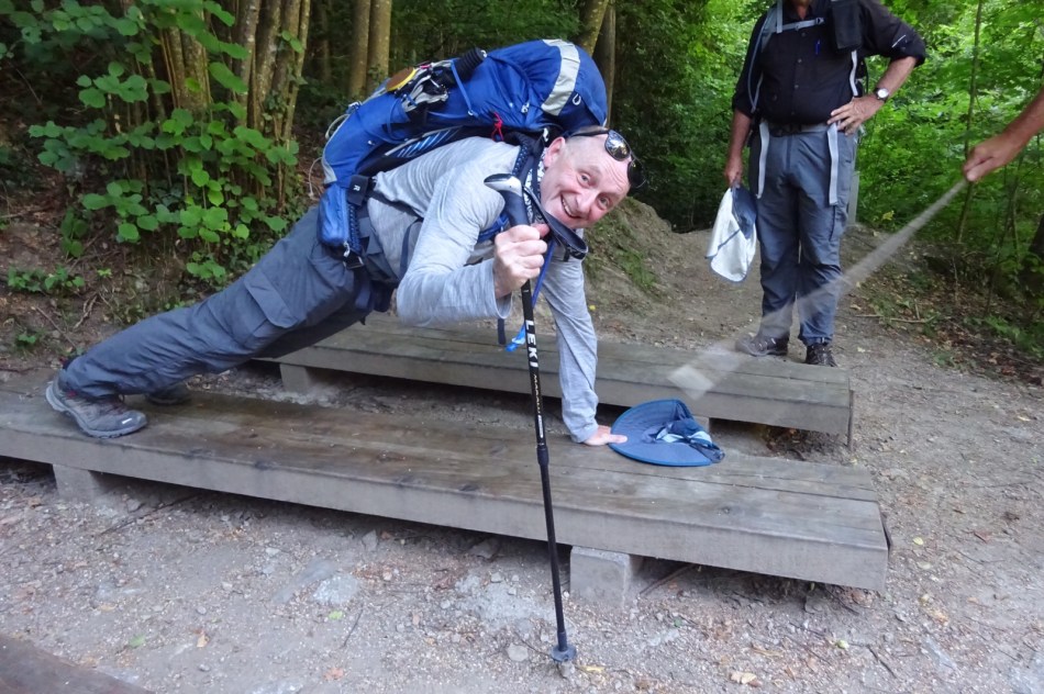 Today’s walk was 20km from Martigny (471m) to Orsieres (887m). The path climbed and fell so frequently that it would be misleading to subtract 471 from 887 to see how much we climbed. Anyway it felt fairly easy. So easy that the local Canton has installed some exercise facilities along the way. The path climbed through woods and crossed pastures. We saw fields of thyme and rushing streams cascading down waterfalls, as you would expect. Cowbells filled the air with music.