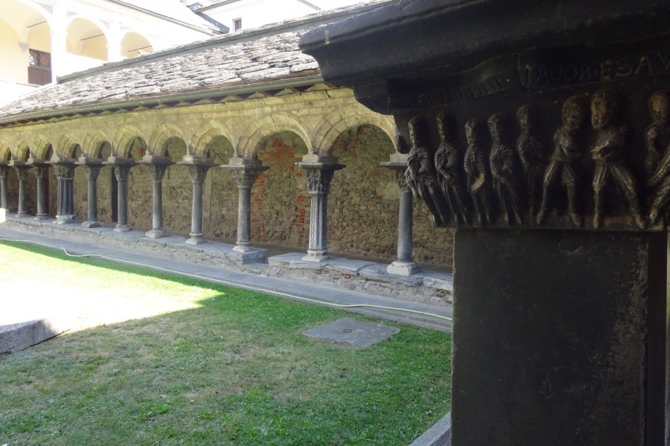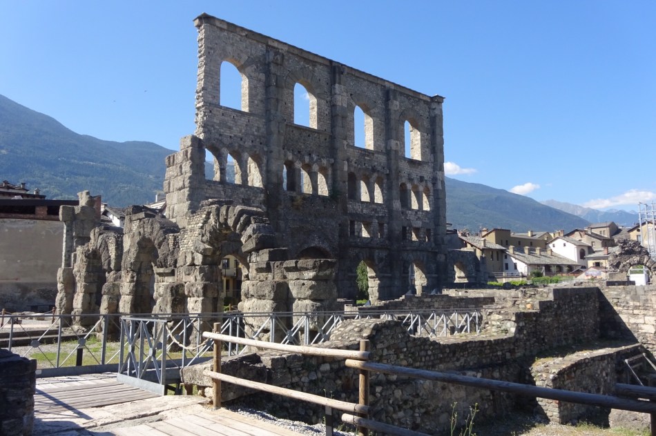 Our reward for reaching Aosta yesterday is a rest day today. Aosta is worth exploring because it dates back to Roman times when the town was founded in a valley leading up to the GSB Pass. Today we visited some Roman remains, namely the theatre and forum plus some old churches. It’s a scenic place: everywhere you look you can see the snow capped mountains in the distance. There are bars and cafes everywhere and gelato bars as well. Black cherry and pear with chocolate was my choice.