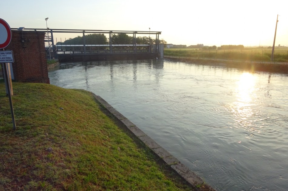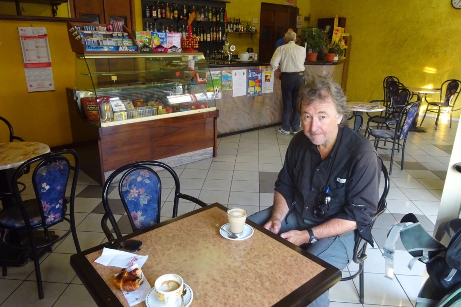 Our race strategy was to stick to the road until the Fiats awoke. Soon we were in San Germano Vercellese, a miserable insect infested settlement surrounded by the paddies. But in this purgatory stood a cafe and it was open. We screeched into it like a Lewis Hamilton pit stop and ordered coffees and croissants. The Asian owner (no Italian would be up this early) refilled my water bottle, I paid the 5 Euro and we were back on the track without dropping a place.