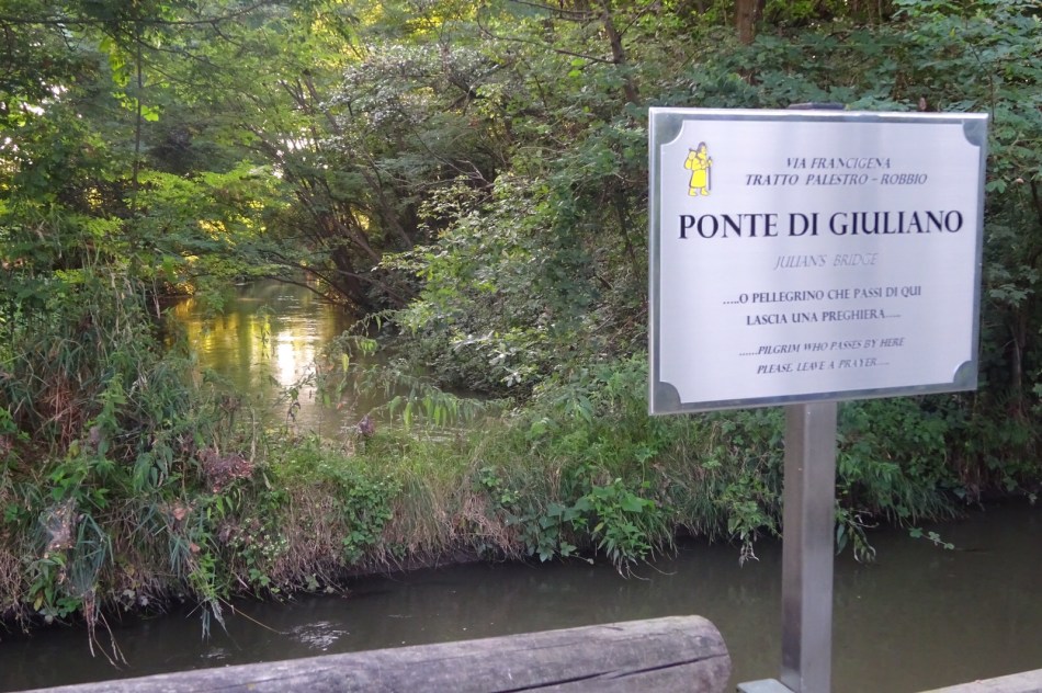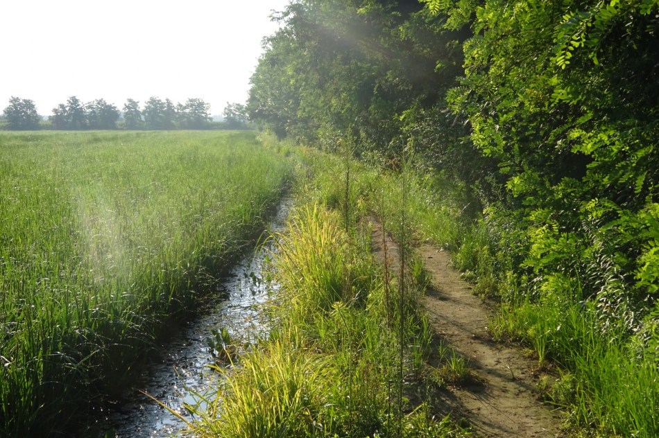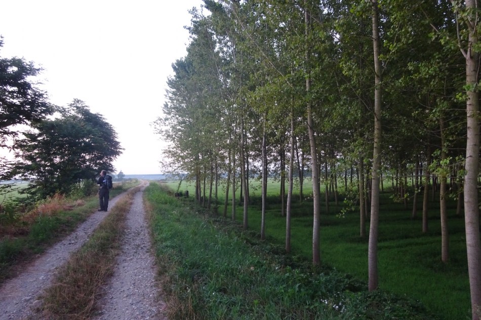 Apparently pilgrims complain about this “Po Valley” part of the slog because it is boring. “Like the Meseta” they say. Utter Rubbish. The Meseta on the Camino Frances is brilliant, an uplifting spiritual experience especially if you’re fortunate enough to share it with a good pilgrim companion. These rice paddies are a rich and diverse habitat, beautifully green and full of water. Naturally the insect population is abundant and irritating but you can hardly blame them for being drawn to a couple of sweaty pilgrims. The bird life is incredible. Suddenly the silence is broken by some huge heron rising out of the paddy like a jumbo jet, wings flapping furiously to gain altitude. Or little birds flying in formation looking for grubs. All the way along the path you hear the plop plop of tiny frogs jumping into the water or the occasional splash of something bigger. I love it. But I’ve been bitten a few times today.