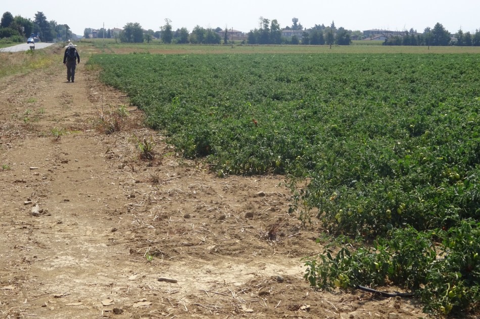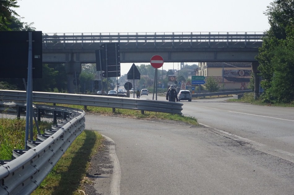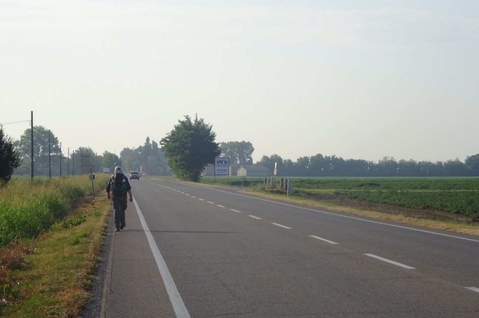 Paul and I considered our options. Two days meandering through the paddies (54km) or one day straight down the old Roman road from Piacenza to Fidenza (40km). Suicidal from Monday through Saturday, it’s as quiet as a paddy on a Sunday and no mosquitoes.