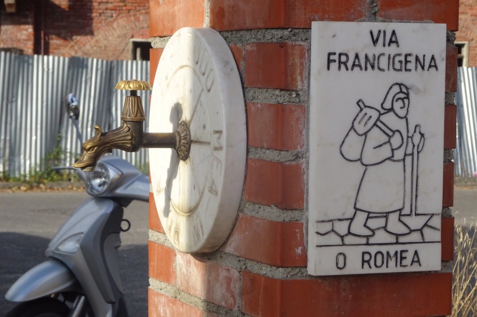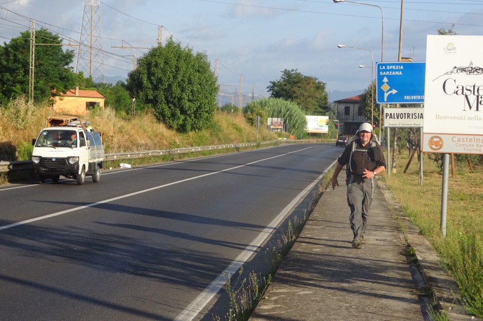This morning we started a bit late on account of our late night in Sarzana. The walk was an urban tarmac experience but it offered numerous bars and fruit shops. I got a decent cappuccino but what is wrong with croissants in Italy? They are all filled with a sugary syrup or if you can find a plain one it will be covered with sugar crystals and will taste like a doughnut. But pop next door to the fruit shop and for a few cents you can buy the huge ripe peaches and nectarines which are impossible to find in Britain. Plus apricots and bananas. It’s fruit heaven.
