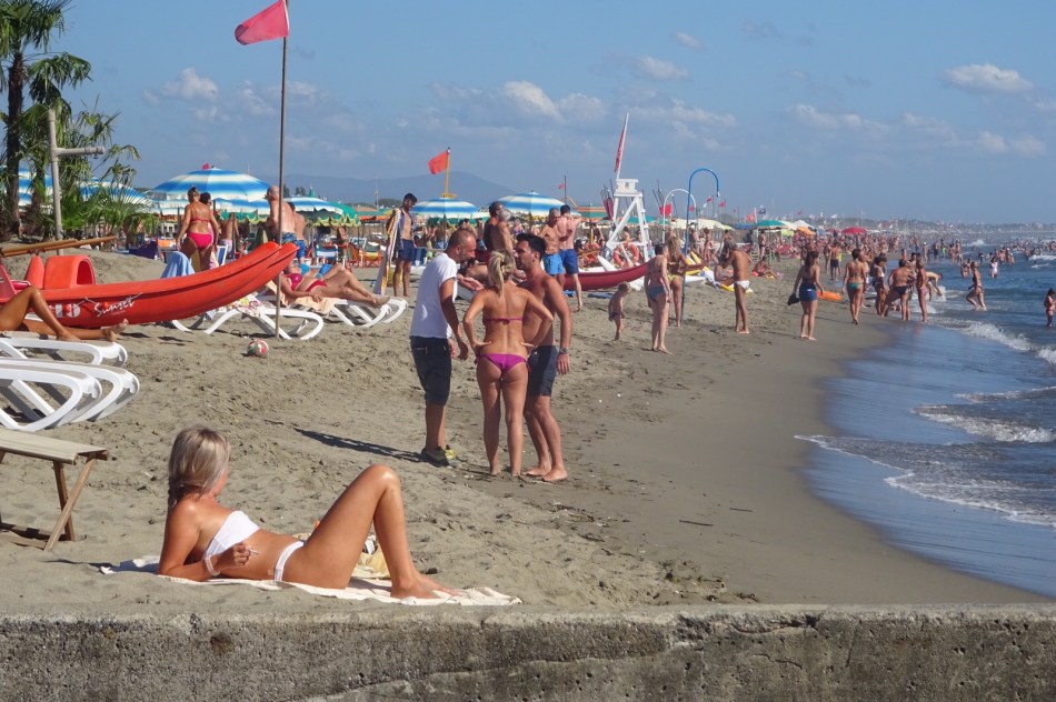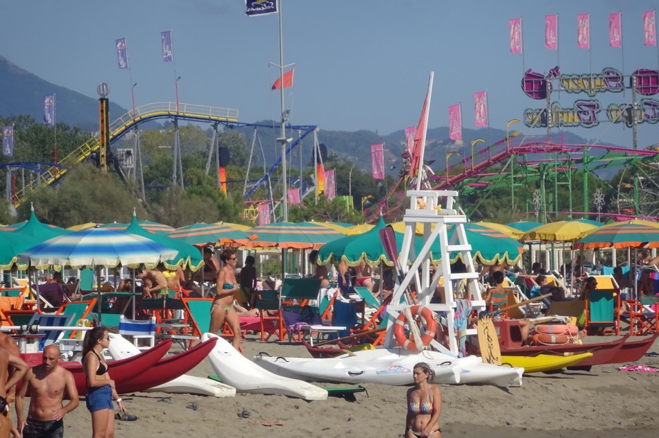 Oh I do like to be beside the seaside. Paul and I couldn’t resist drifting slightly off course to reach the Italian seaside at Cinquale. Seaside places are the same everywhere: beach, funfair, bars, ice creams, umbrellas, postcards. Well maybe not postcards. I can’t remember when I last sent a postcard.