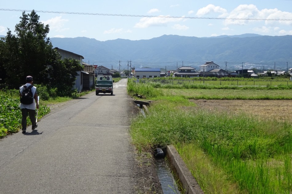 It’s still very hot and humid, 32 degrees today. There are no cafes or bars but plenty of vending machines selling energy drinks. Lunch was an apple cake. I declined the option of a large bag of dried sardines but who knows, it may come to that. I’m walking through rice paddies. They are dry and the mosquitoes have moved on.