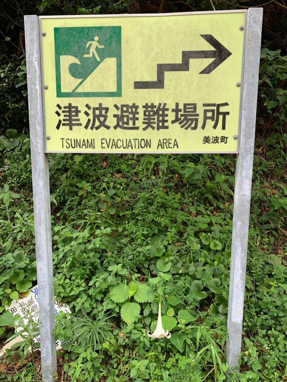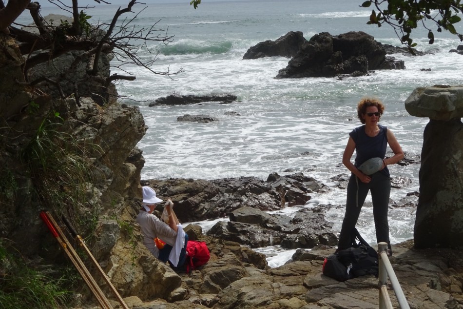 During the day we came around a bend in the road and a clearing in the trees to see the Pacific Ocean which will be the backdrop for the coming days. We reached a large beautiful bay and, from the map, you’d expect to find a row of cafes and shops but the whole place was deserted. Only two WCs and several tsunami evacuation signs.
