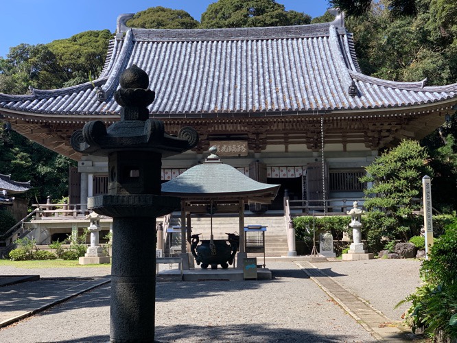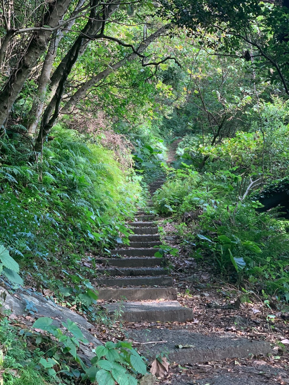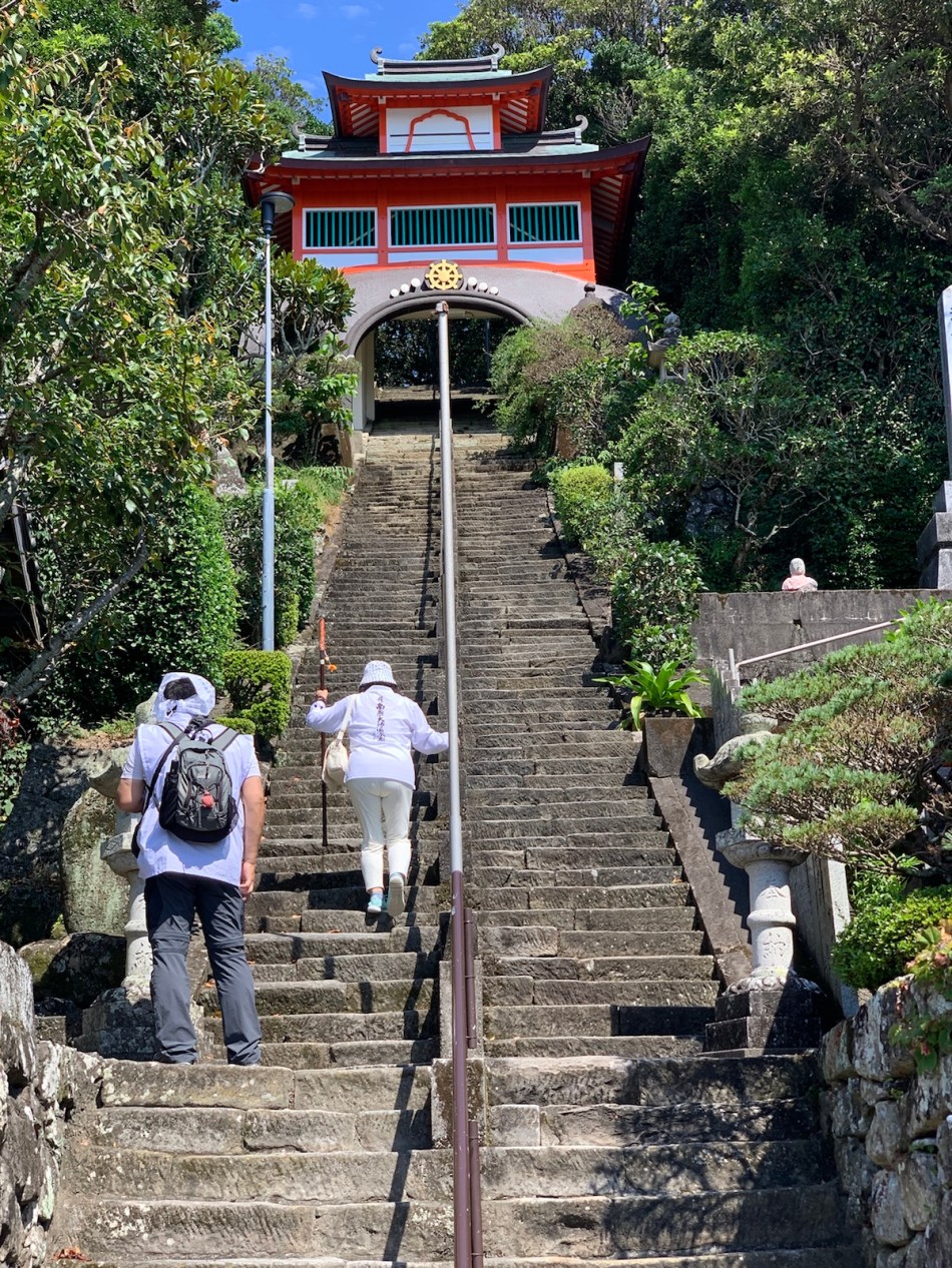 Just below the temple is a lighthouse which commands a wide view of the ocean, perched on the very tip of Cape Muroto. From there, the route took me back to sea level and through more villages. The approach to Temple 25 resembled a funicular railway without the railway. Then the serene Temple 26 required another short climb through woods but a long gentle descent on a narrow path among crops. Rural Japan at its finest.