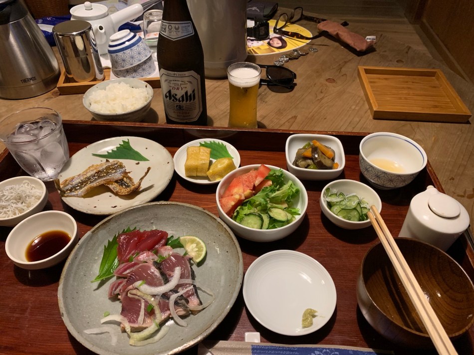 Dinner was brought to my rooms in the traditional manner. A feast. Here’s an odd thing though. The rice machine was brought in and switched on. I haven’t got to the bottom of the rice business but it seems to be eaten at the end of the meal. Same in the hotel last night. The waitress came to check I’d quite finished before clearing the dishes and then producing a dish of plain white rice. It also seems to be a complete no no to have rice and alcohol on the table at the same time. When the man came with my beer the woman went into apologetic sumimasen mode and tried to put the rice back into the cooker. I pleaded for sanity, citing examples of the best restaurants in New Delhi where rice and beer were tolerated together. They departed, quite bemused by my poor manners. And then I was caught retrieving my washing from the utility room wearing my outdoor slippers. I doubt they’ll accept any more foreigners, it’s just not worth the trouble.