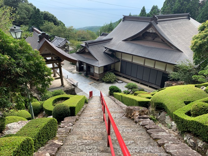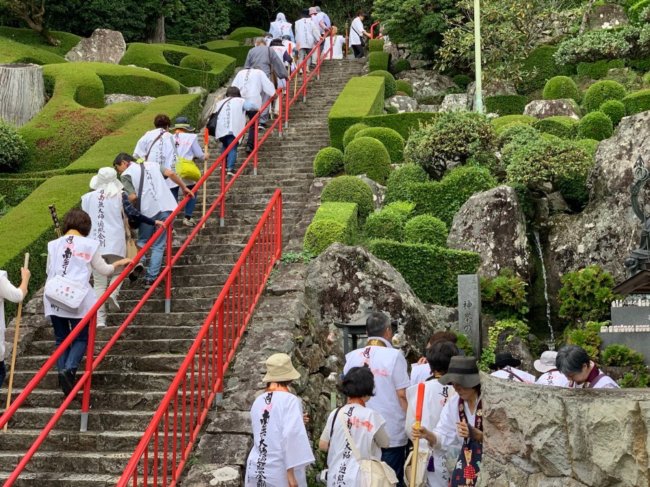 It was a very steep climb to the temple. There was a trail plus a winding road. Towards the top the trail joined the road and 6 minibuses packed with Japanese pilgrims drove past, all cheering me. They were all keen to hear about my pilgrimage and I managed to tell them I come from Rondon and I’m walking all 88 temples in about 22 months.