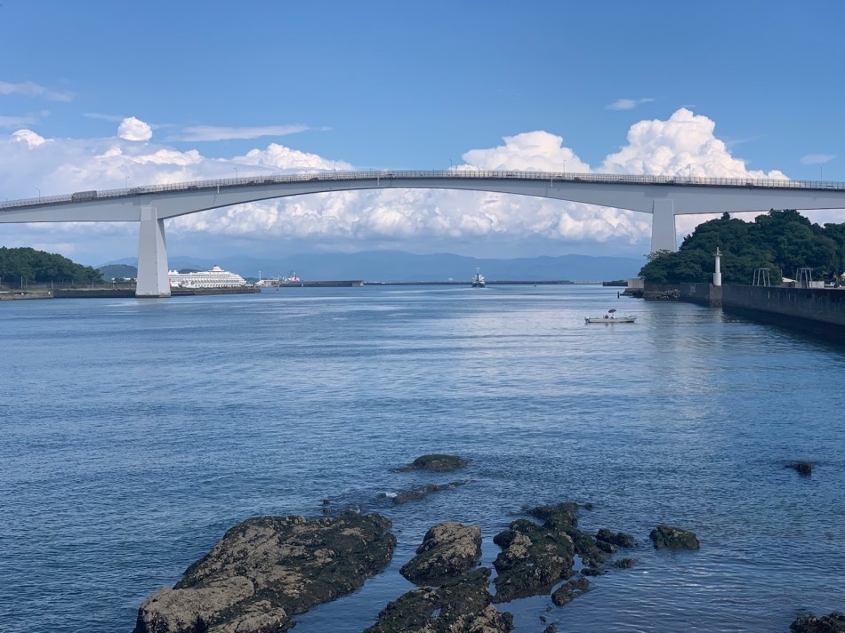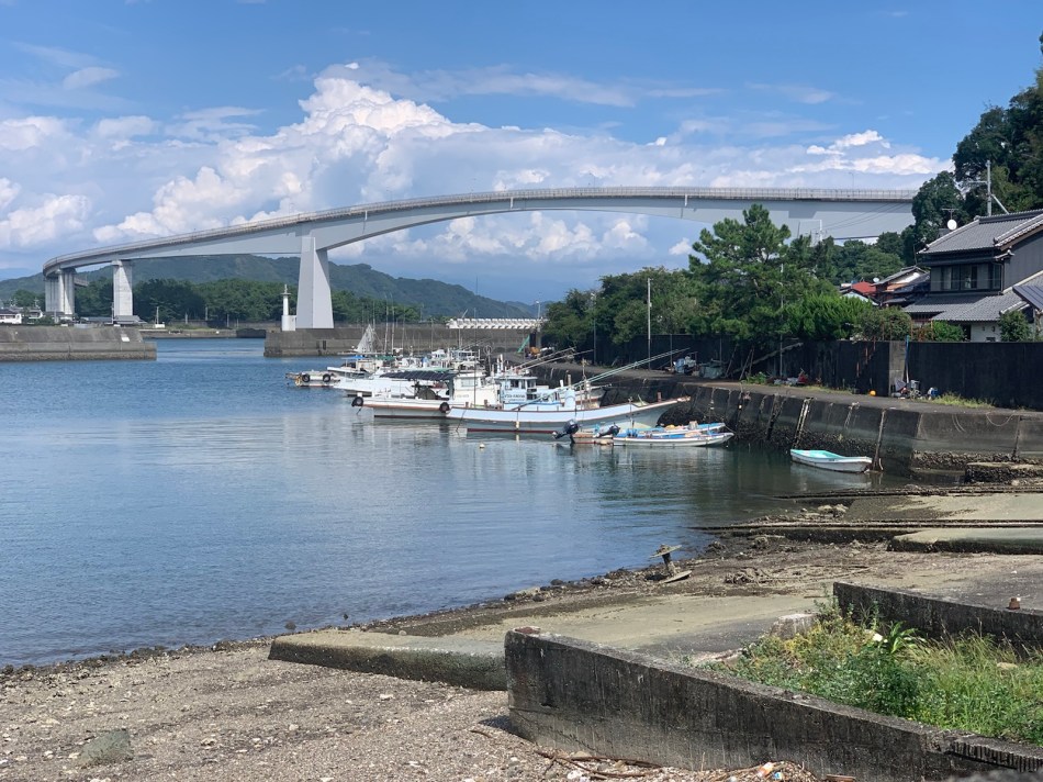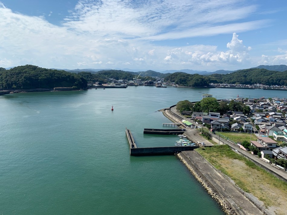 I loved that bridge…I thought it was a marvel! I really enjoyed the walk across & the views were spectacular; fishing boats moored safely behind the tsunami wall protecting their village, the harbour entrance, the ocean, surrounding hills with lush vegetation.