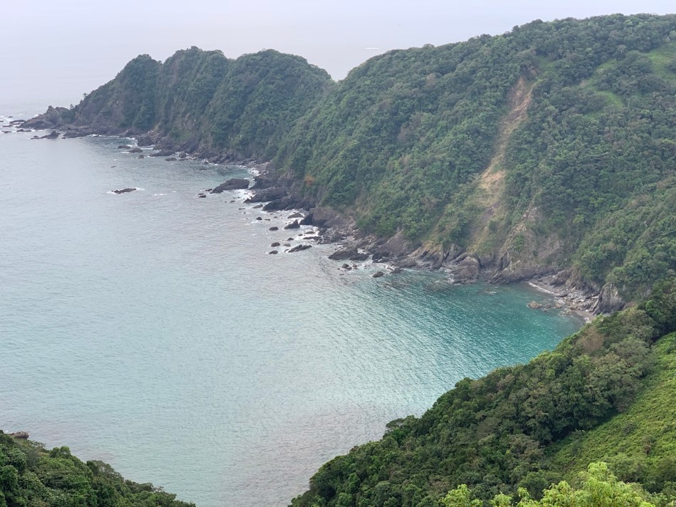 We said goodbye to Cecile at Temple 36 and set off along the coastal road which, according to the map book, offers breathtaking views. It was right. There are two breathtaking views but everywhere else the view was obscured by trees. The road climbed and fell over the cliffs with many hairpin bends. I wish I’d been driving one of the many Toyota Supras which were being flung around the bends at speeds way in excess of the 40Km speed limit. It looked great fun. But it was no place to be walking.