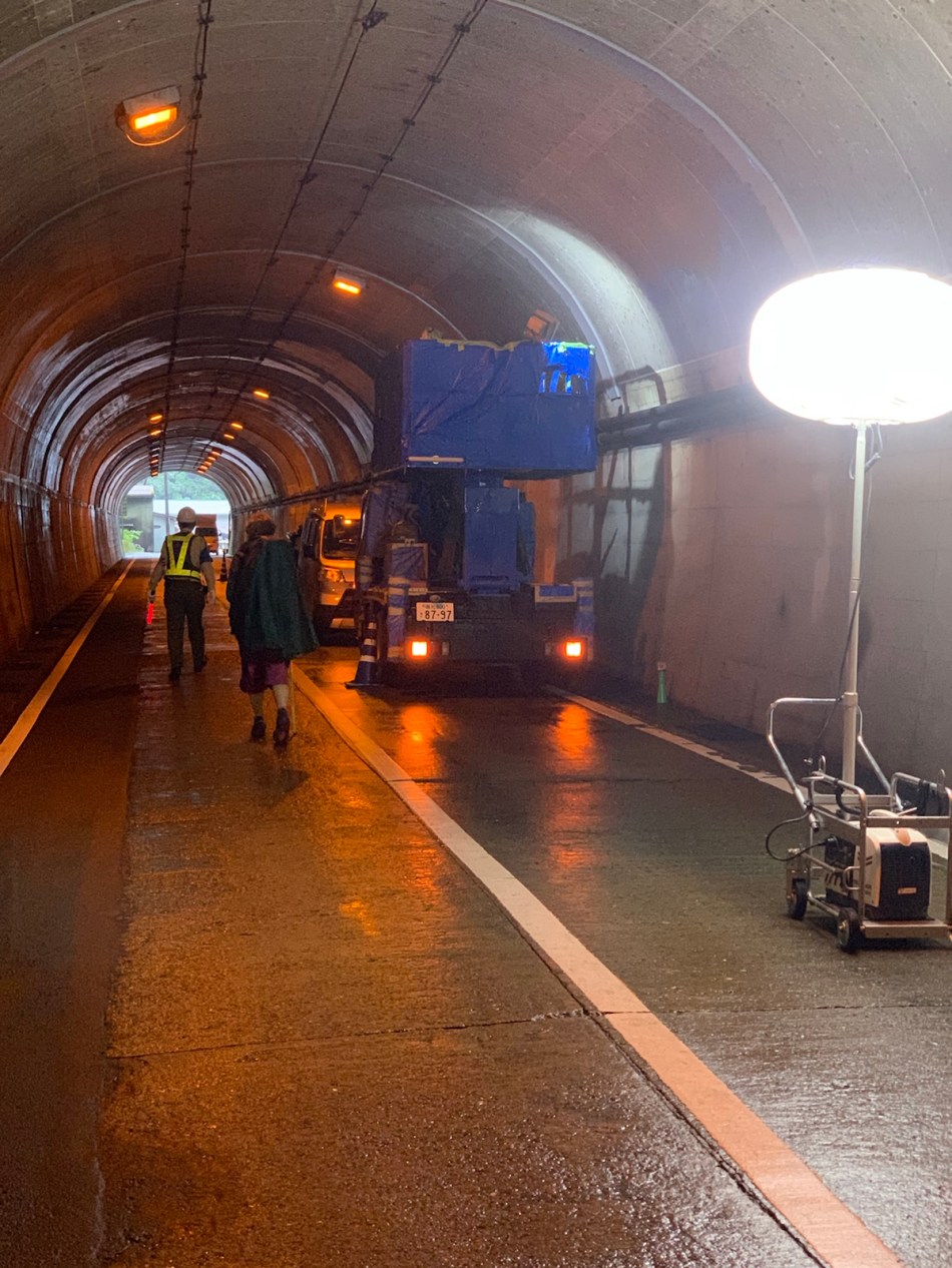 On and on we walked. Lunch in Family Mart convenience store (it has seats so you can eat your purchases). Several road tunnels gave some respite from the weather; one was 996m long. In another tunnel which might have been rather dangerous, workmen were inside replacing broken light bulbs. They had closed one lane which we were able to walk along but then the chief led us past all their equipment and out to safety, waving his flashing wand at all the traffic. I will see if I can buy one in 7Eleven.
