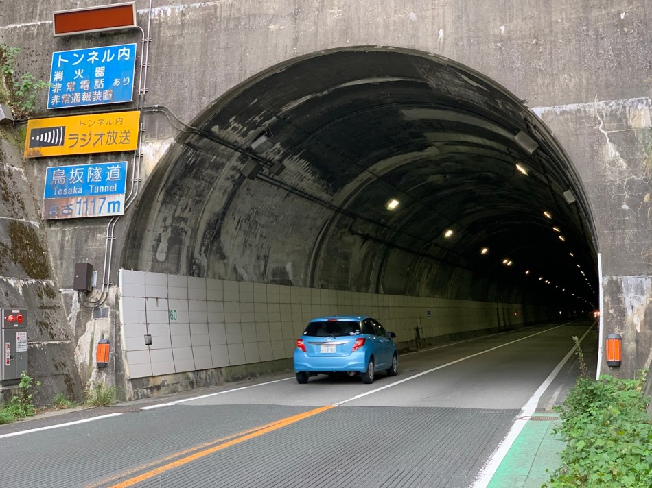 Tosaka tunnel 1117m long and definitely the worst so far. I had my LED lamp lit all the way
