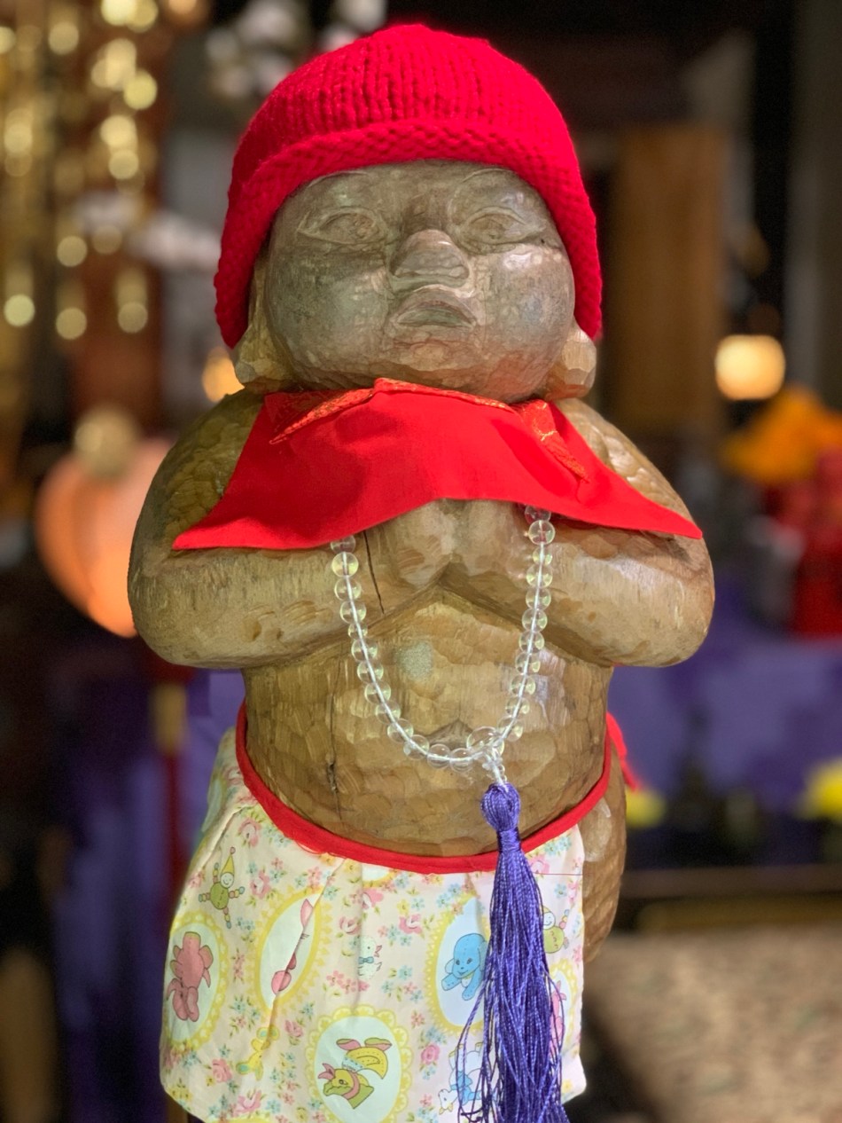 You’ll see Buddhist and Shinto statues all over Japan dressed with red bibs and hats. I think it could be a football thing.