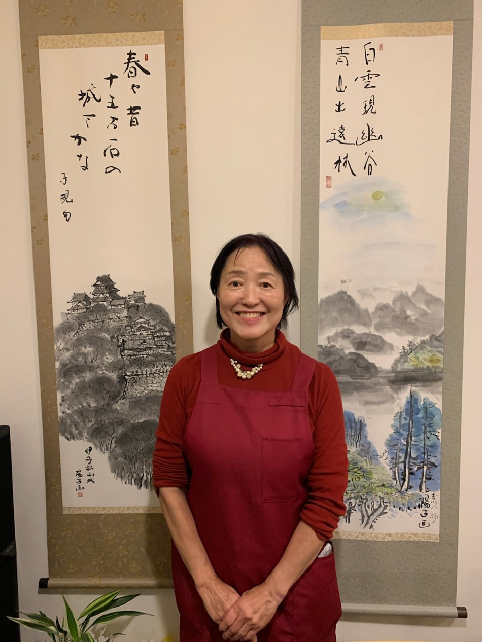 I caught sight of a CD of Bach’s sonatas and partitas signed by the artist and a good stereo system. Culture! Music! The lady, Yoko, showed me her paintings of Matsuyama castle with impressive calligraphy. I told her I’d visited the Shiki museum in Matsuyama and she told me the calligraphy was a haiku by Shiki.