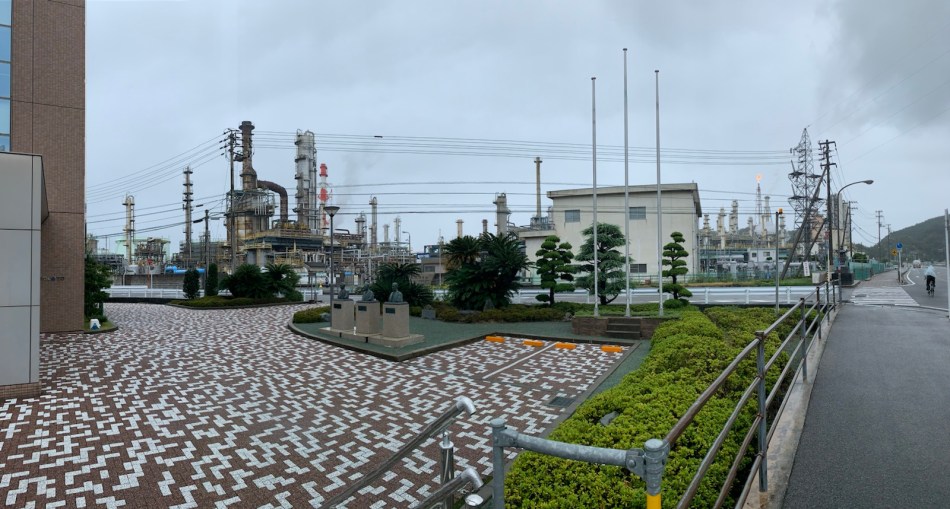 Soon the rain fell and I returned to the dreary landscape enlivened only by an oil refinery. And the two temples were dreary too. I checked into the Plaza hotel in Imabari but there was no one there to put newspapers into my damp boots or hang my wet clothes.