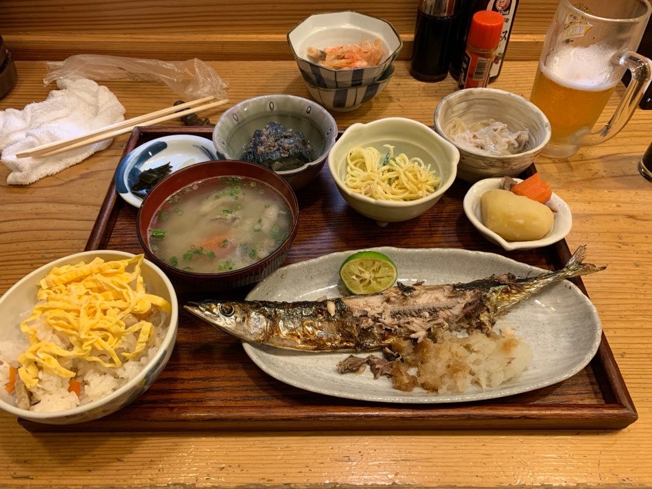 My last remaining challenge of the day was to find dinner in downtown Imabari City on a Saturday evening. There’s not a lot of choice but I saw a few lanterns down an alley which indicates dinner and an impossible menu and walked straight in. I might have just walked into someone’s house. A woman welcomed me and showed me a few empty tables but I sat at the bar. Two men were drinking beer. I must have interrupted the conversation, it being somewhat unusual for a British man to stroll into their parlour. I ordered beer and any sort of fish as long as it was hot and part of a set (including rice and the usual bits and pieces).