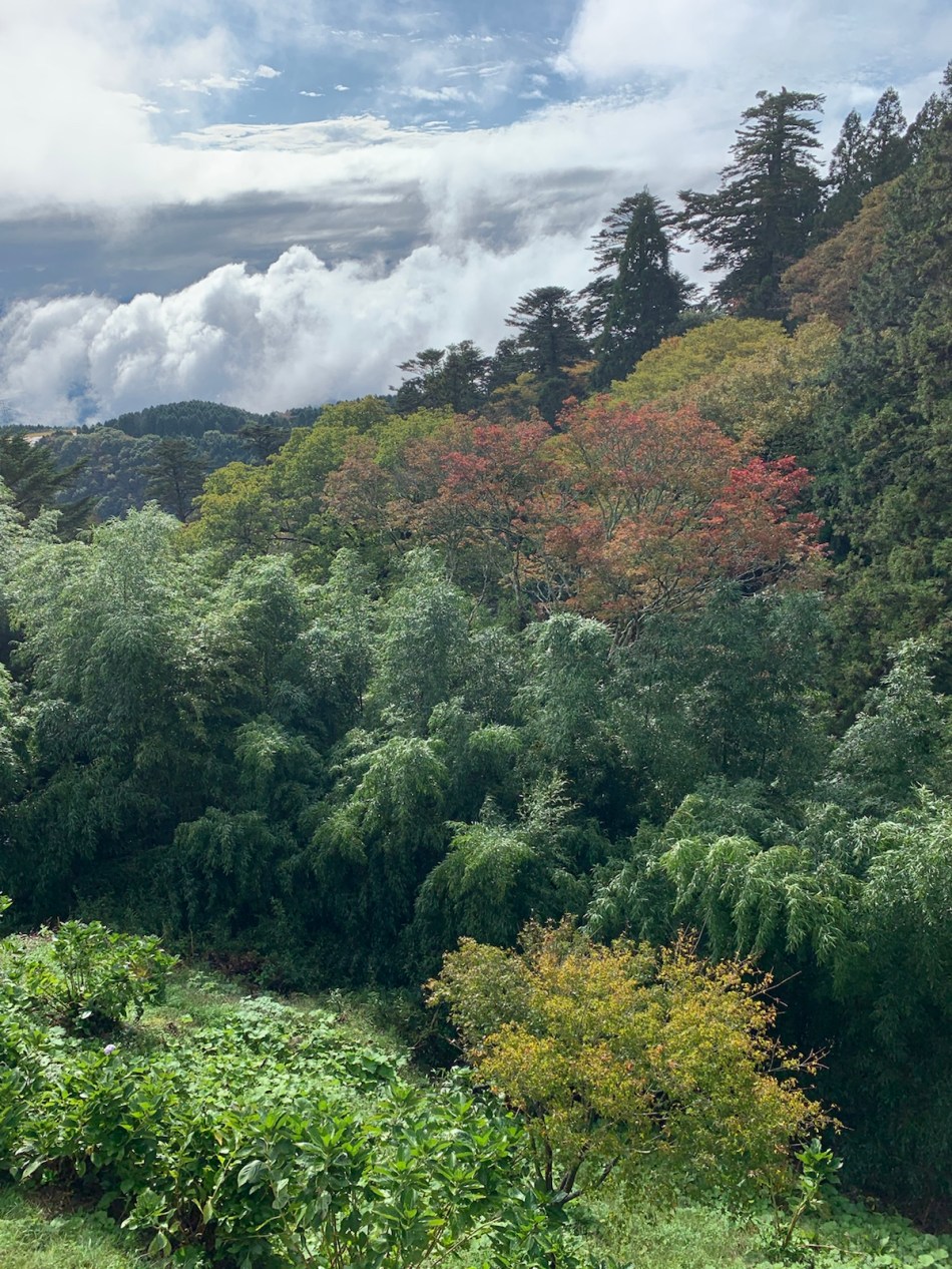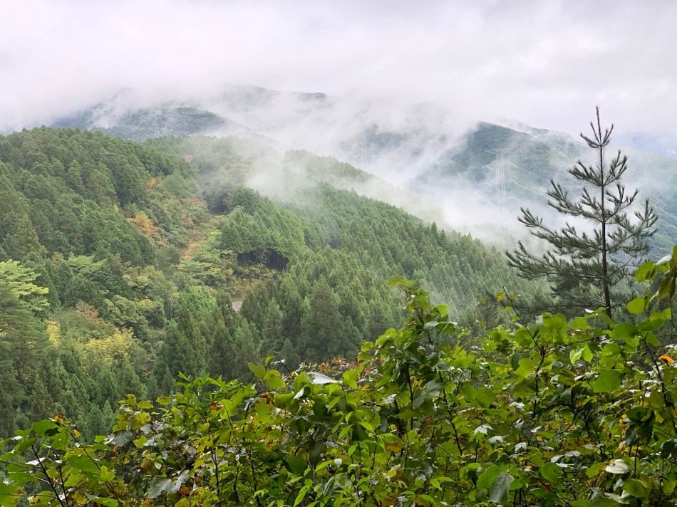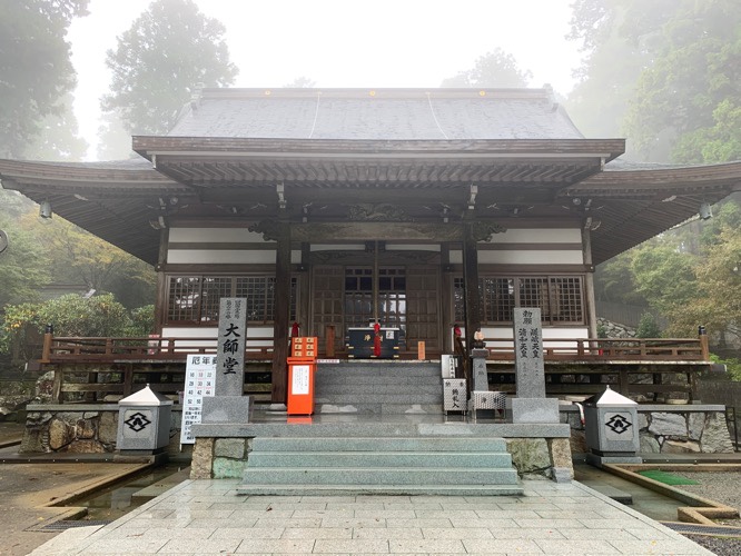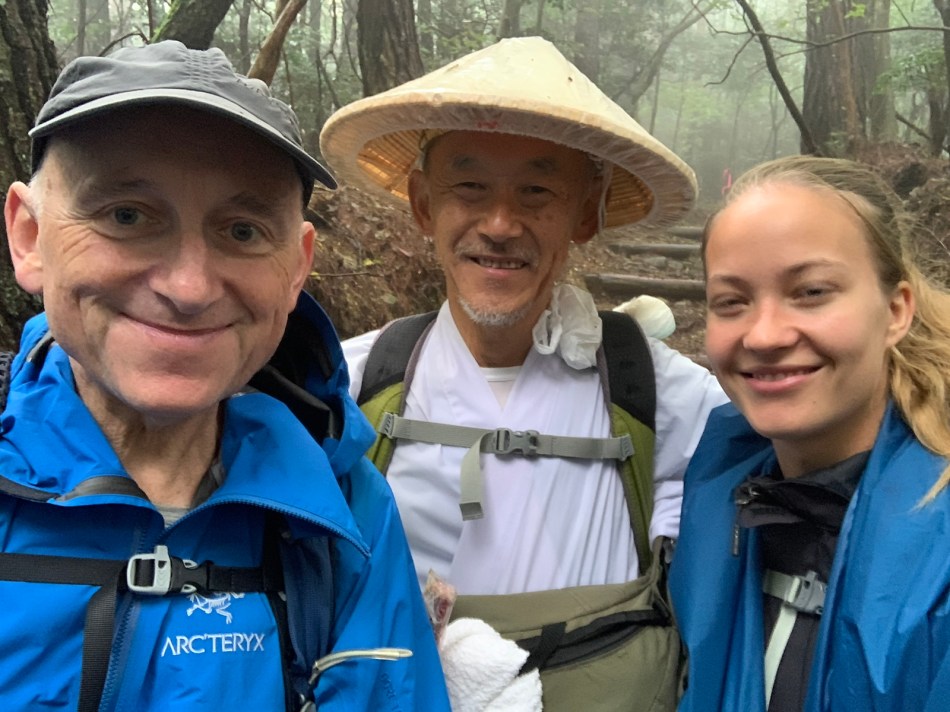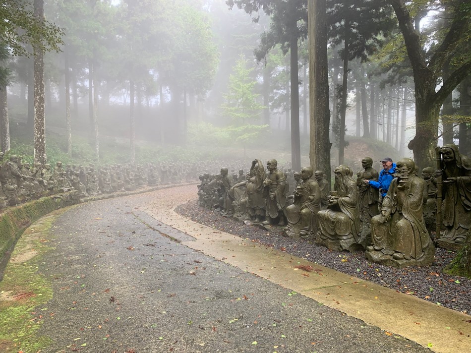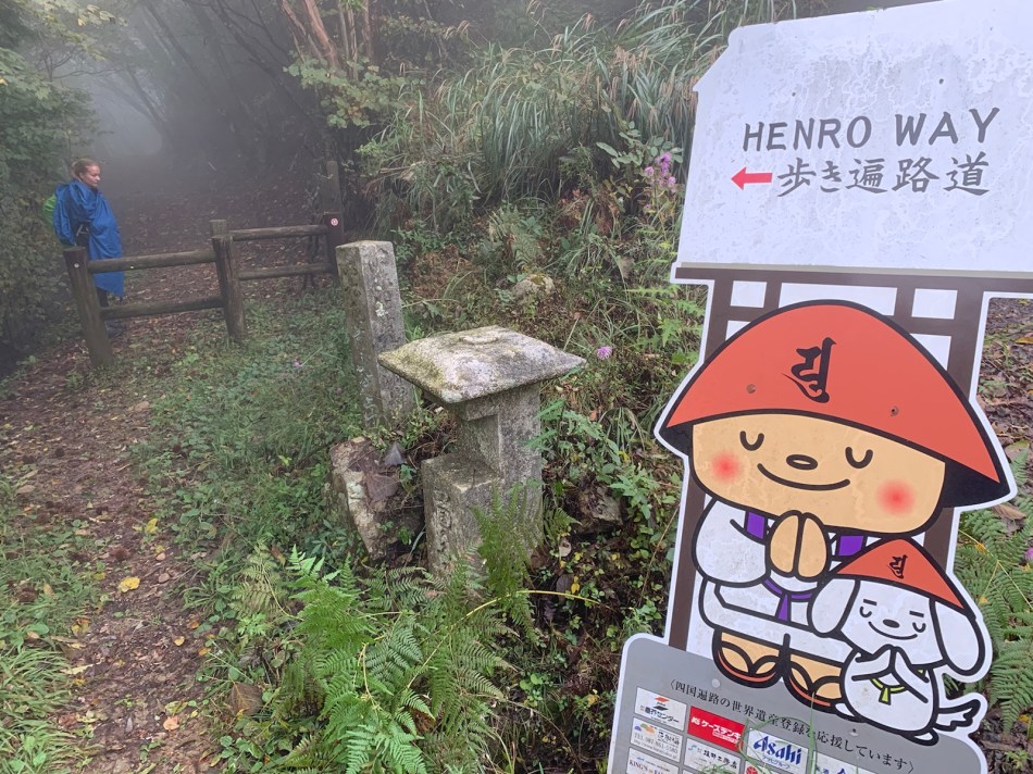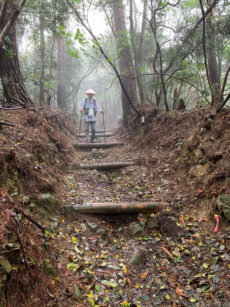 I stopped to take pictures and saw the ghostly figure of a pilgrim emerging through the mist. It was one of the Japanese men who stayed in the ryokan last night. He joined us for the rest of the day and with the help of Google translate we learned that this is his third Shikoku pilgrimage, he is 69 and is fighting liver cancer. He took us to a ramen restaurant for lunch intending to pay for us but the restaurant people wouldn’t accept a yen.