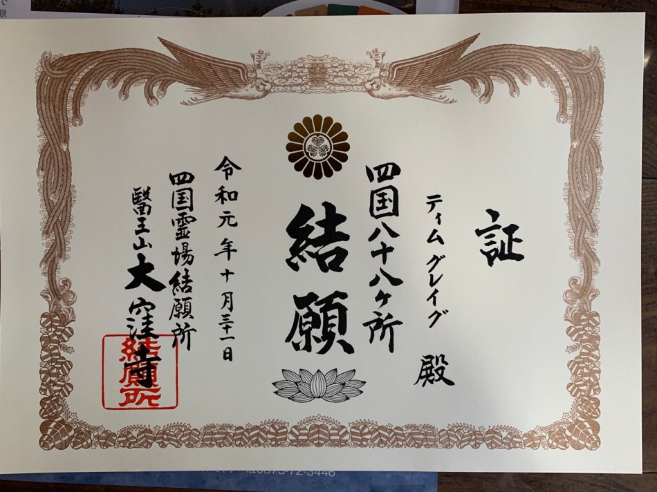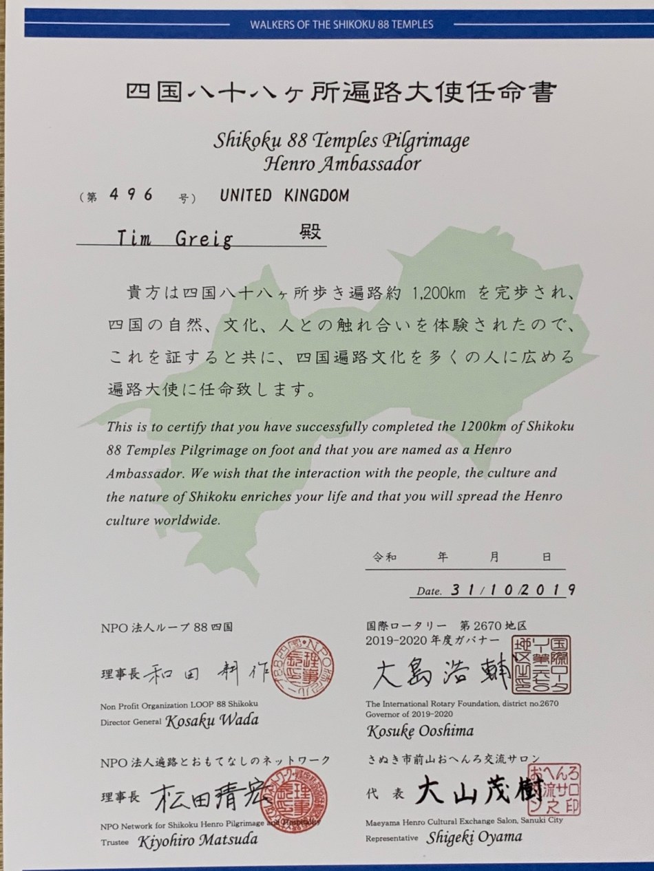 On the way we visited the museum which tells the story of the pilgrimage and we received a personalised certificate and goody bag. This included a DVD containing photos of every temple. It sums up how Japan has stood still in some ways.