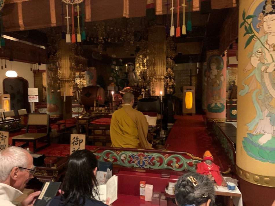 It was a strange evening ceremony in Temple 6 last night. But first we enjoyed another inadequate dinner made up of the usual bits and pieces without anything of substance. I’ve lost 5Kg since I left home. That’s 69kg down to 63kg.