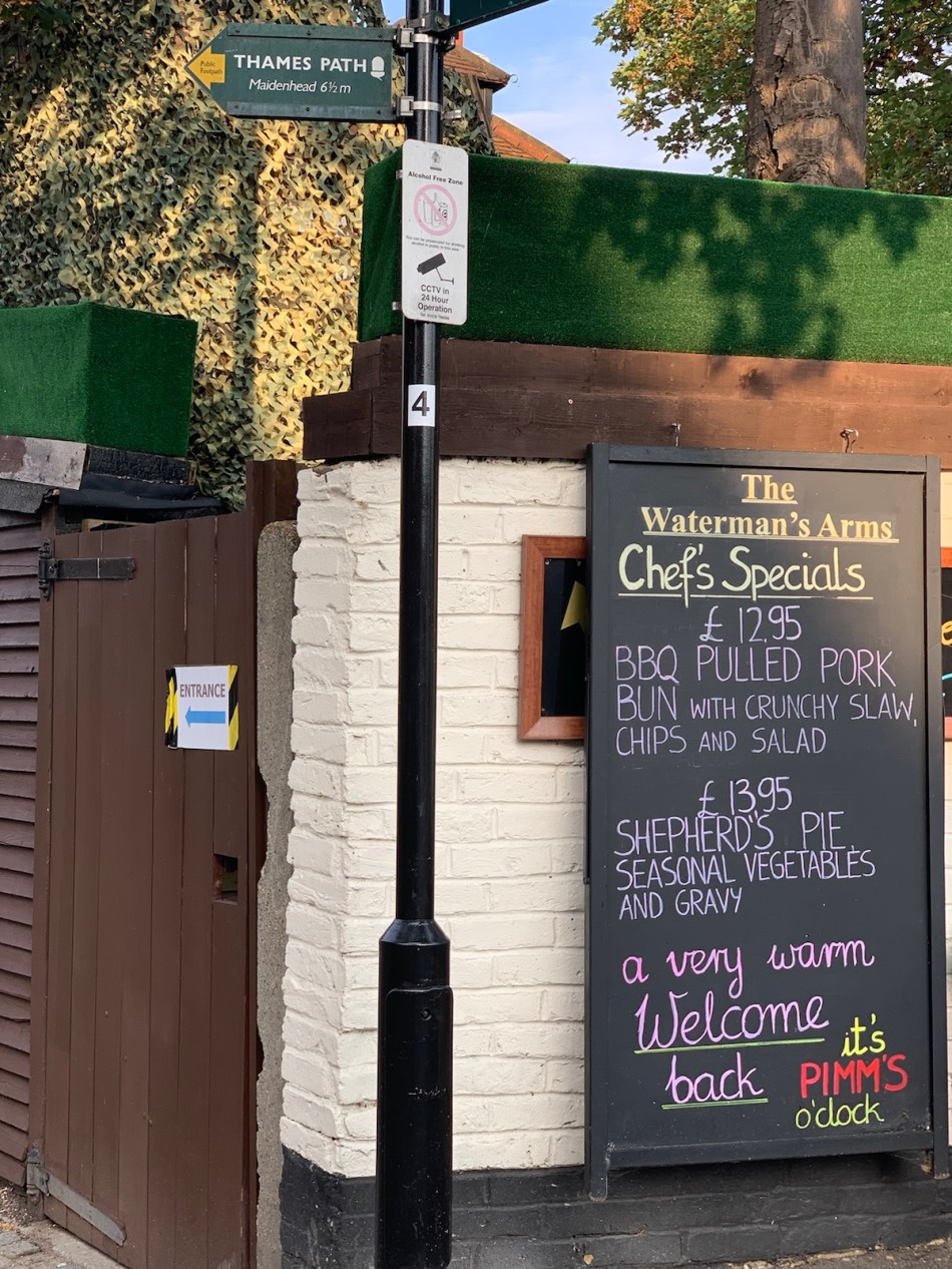Bourne End was also nice but there were no pubs to be seen. Just a derelict restaurant with a “for sale” sign. Finally I arrived in charming Marlow at 1.15pm. The hotel offered me the option of an early check in for £10 or lunch in a nearby pub. Once again I drove the UK National Debt further into the red and ate a delicious vegan curry. It was training day for a new batch of school leavers and I was the perfect trainee customer. “What table number?”, she asked. “600” I replied but I was reading upside down. “No 9” the distraught manager yelled back. 009. At least he didn’t make me wear a face mask.
