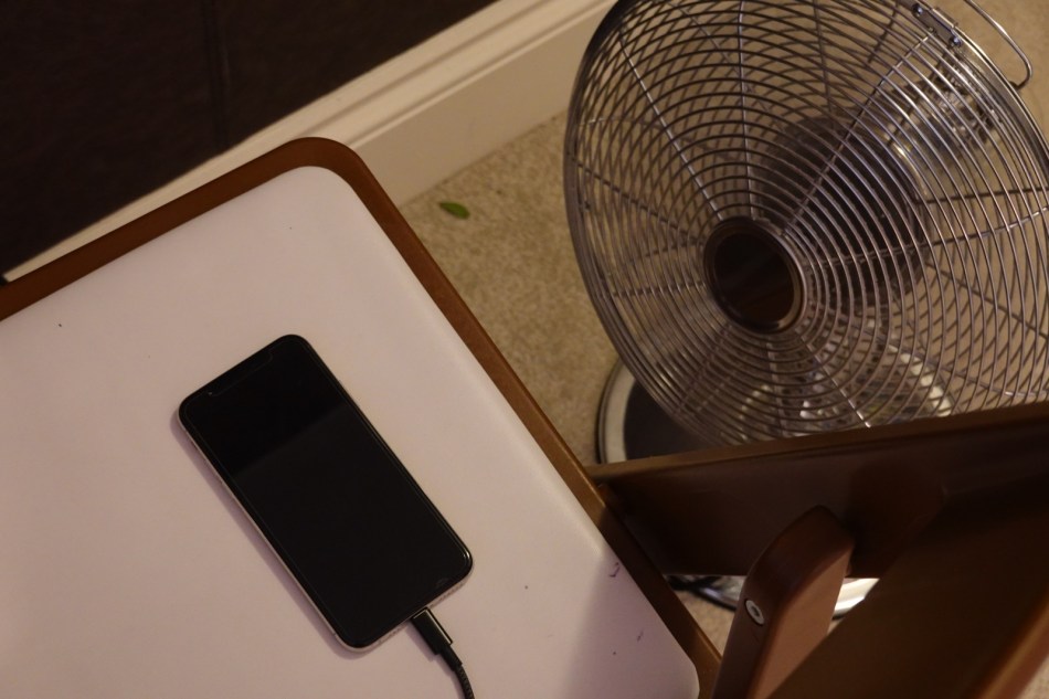 I had 3% battery left which was just enough to get onto Amazon and order the first waterproof case on the list for next day delivery. I rigged up the fan in the room, directed it at the iPhone and just before dinner the thing beeped.