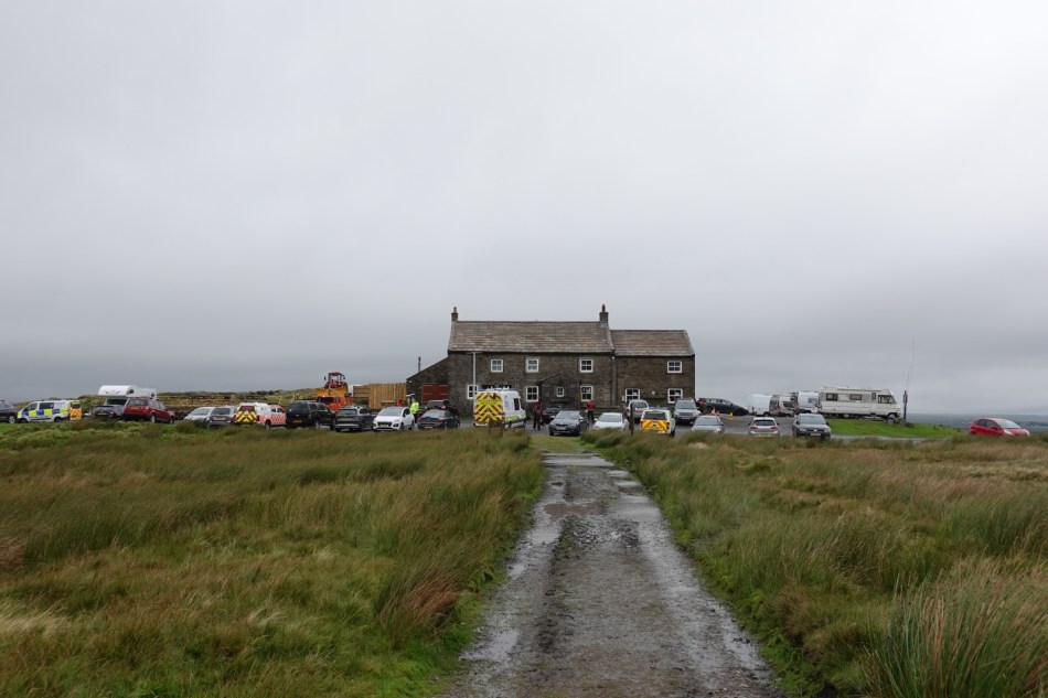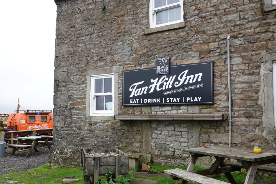 Jacquii at the B&B told me not to bother with a flask of coffee because there’s a pub. You wouldn’t imagine a pub in such a desolate place. I counted down the metres as it appeared in the mist, the Tan Hill Inn, the highest isolated pub in England at 528m. I could see all the mountain rescue vehicles parked outside and, as I approached, a RAF helicopter flew over me and landed by a flare.