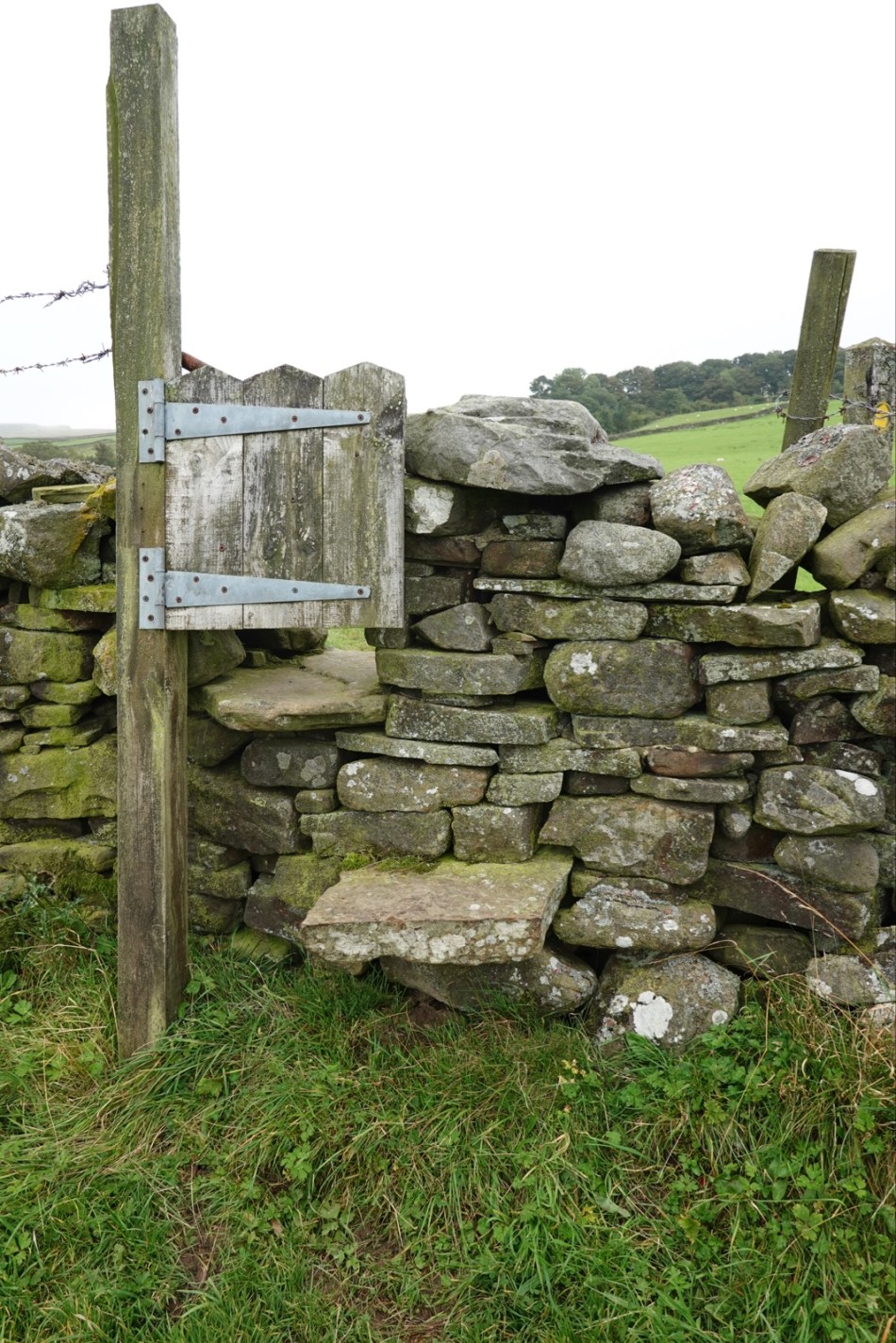 A typical dry stone wall stile with a little door to stop the sheep hopping over